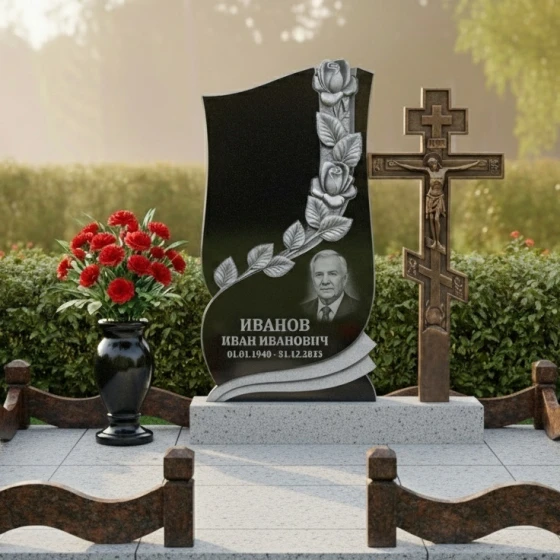 Особое внимание привлекает мастерски выполненная резьба, украшающая левую часть стелы. Здесь расцветают пышные розы, чьи лепестки вырезаны с поразительной детализацией. Каждый бутон, каждый лист обладает объёмом и реалистичностью, создавая игру света и тени. Эти розы, символ любви и скорби, словно живые, обвивают камень, придавая ему нежность и одухотворённость. Их матовая, светлая фактура контрастирует с глубокой зеркальной полировкой основной части стелы, создавая эффектный визуальный акцент и подчёркивая тонкость ручной работы.