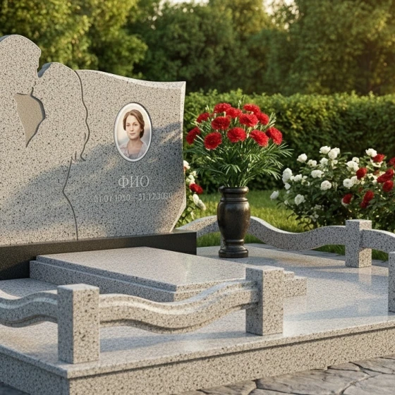Взглянув на эту мемориальную композицию, сразу обращаешь внимание на ее уникальную форму и фактуру. Стела представляет собой динамичное сочетание двух волн, словно обнимающих друг друга. Левая часть стелы плавно изгибается, формируя силуэт склонившейся фигуры, а правая, более высокая, напоминает развернутое знамя или свиток, придавая всей композиции ощущение движения и легкости, несмотря на массивность камня. Это не строгие линии, а мягкие, органичные контуры, которые вызывают чувство умиротворения и глубокой задумчивости. Центральная часть стелы, выполненная в контрастном темном граните, идеально подходит для гравировки портрета, создавая яркий акцент на светлом фоне основного камня. Овал, обрамляющий фотографию, выглядит изящно и гармонично вписывается в общую концепцию. Тонкая гравировка имени и дат жизни выполнена с ювелирной точностью, подчеркивая важность каждого элемента.