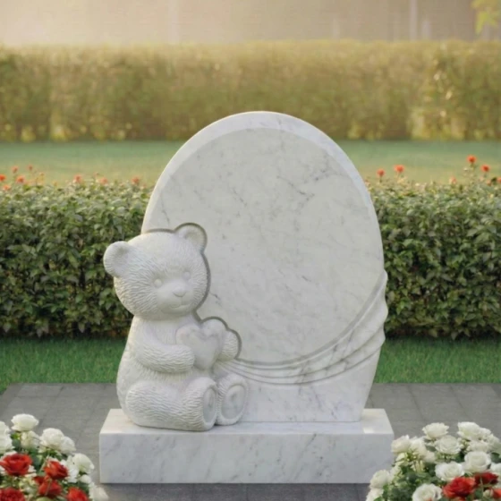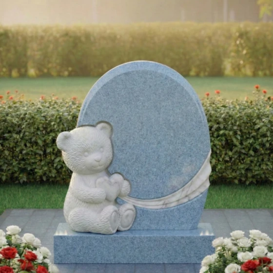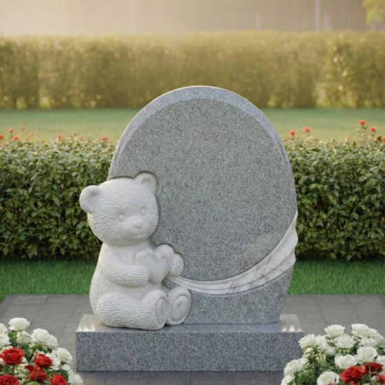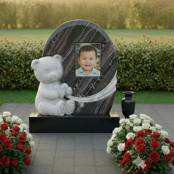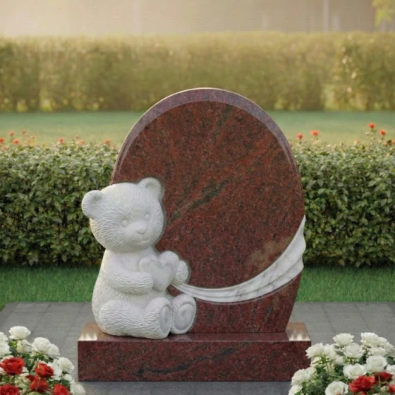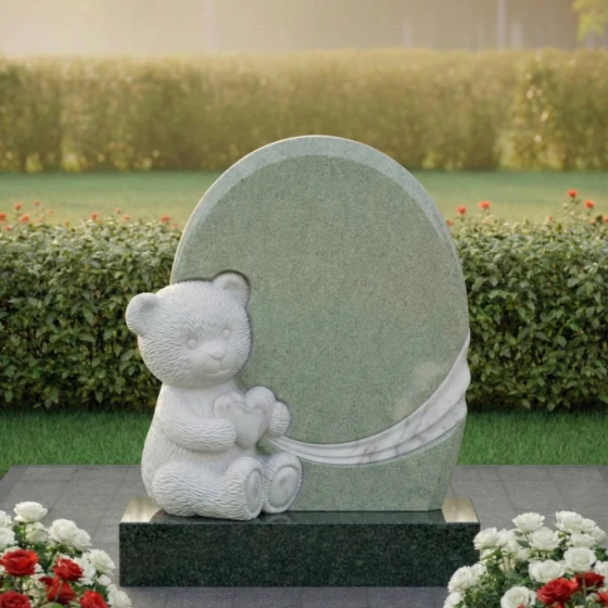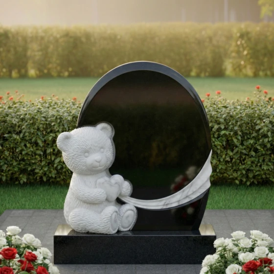 Особое внимание привлекает резная фигура плюшевого мишки, выполненная в светлом, почти молочном оттенке камня, который резко контрастирует с темной полированной стелой. Мишка сидит, слегка наклонив голову, и нежно прижимает к себе маленькое сердце, символизирующее любовь, привязанность и невосполнимую утрату. Каждая складочка, каждый завиток шерсти, каждый коготок проработаны с невероятной детализацией, придавая фигуре живость и трогательность. Матовая фактура камня на фигурке мишки создает ощущение мягкости и тепла, словно это настоящий плюшевый друг. Элемент белой драпировки, плавно обвивающий нижнюю часть круглой стелы, добавляет изящества и символизирует прощание, легкое дуновение ветра, уносящее светлые воспоминания. Этот элемент также выполнен с матовой обработкой, что подчеркивает контраст с зеркальной поверхностью стелы и придает композиции художественную завершенность.
