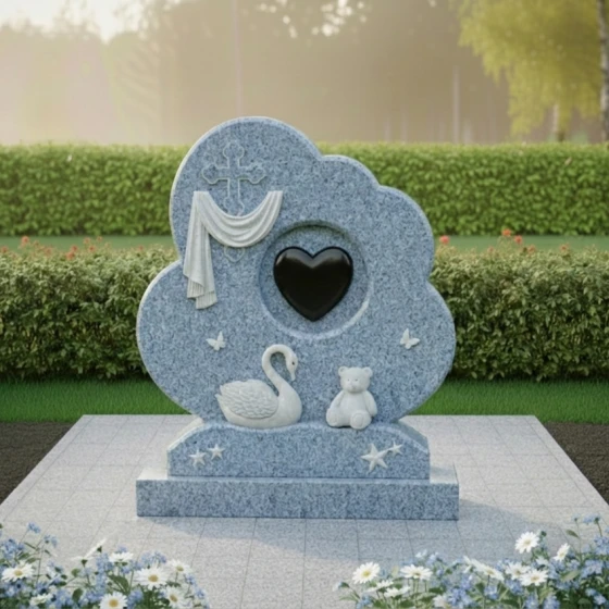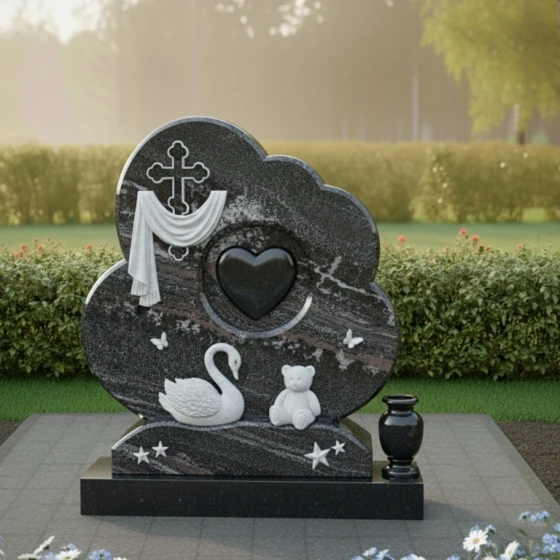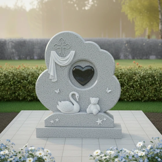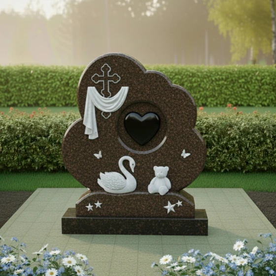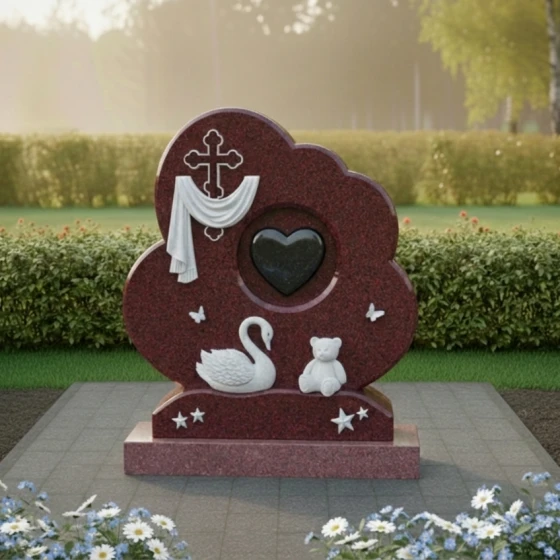 Форма этого мемориального комплекса глубоко символична. Плавные линии и мягкие очертания стелы олицетворяют покой и умиротворение, напоминая о тихой гавани, где душа находит вечный приют. Драпировка вокруг креста говорит о скорби, но одновременно и о защите, которую дарует вера. Сердце в центре – это не просто символ любви, а средоточие всех чувств, которые связывают нас с ушедшим. Лебедь и мишка, окруженные бабочками и звездами, создают образ невинности, чистоты и вечной нежности, напоминая о хрупкости жизни и красоте души. Этот памятник – это не прощание, а обещание помнить, любить и хранить светлый образ ушедшего человека в своем сердце навсегда.