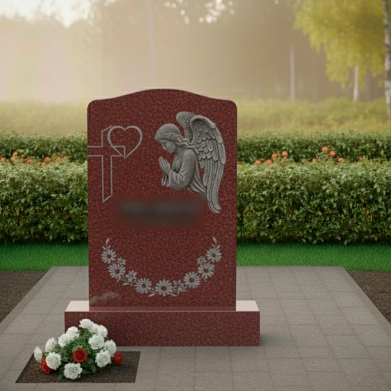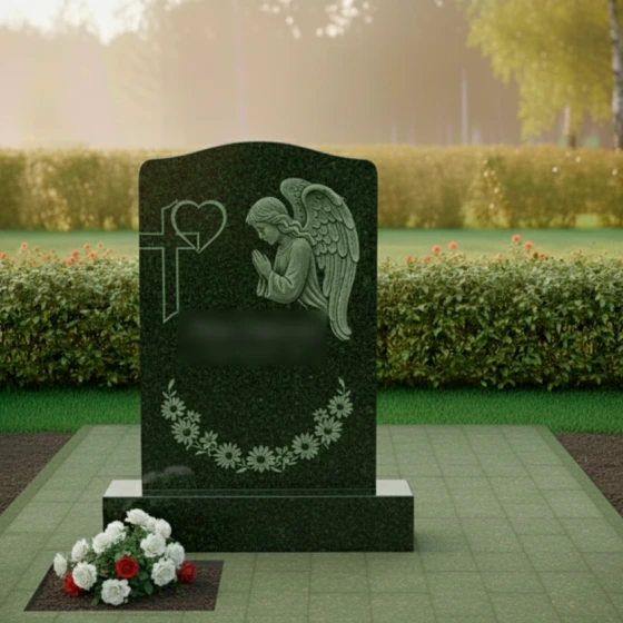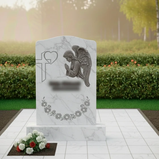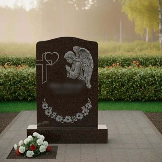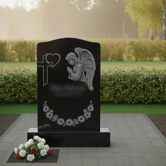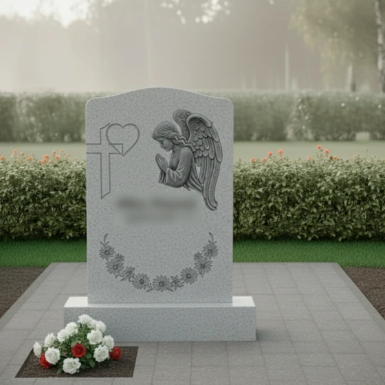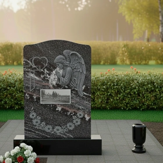 Центральное место на стеле занимает барельеф ангела, склонившегося в молитве. Его крылья, выполненные с удивительной детализацией, кажутся легкими и воздушными, а каждая перышка проработана с ювелирной точностью. Лик ангела выражает глубокое умиротворение и смирение, его руки сложены в молитвенном жесте, что придает композиции нежность и духовность. Рядом с ангелом расположено лаконичное изображение православного креста, выполненное в строгих, но изящных линиях. В верхней части креста, где обычно располагается табличка с именем, находится стилизованное сердце, которое придает кресту особую теплоту и символизирует вечную любовь и память. В нижней части стелы, словно венок, вырезан изящный орнамент из полевых цветов. Каждый лепесток, каждый стебелек выполнен с невероятной тонкостью, создавая ощущение живого, трепетного букета, который обрамляет основание стелы, привнося в композицию нотки природы и нежности.
