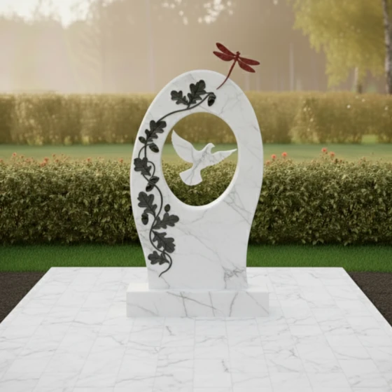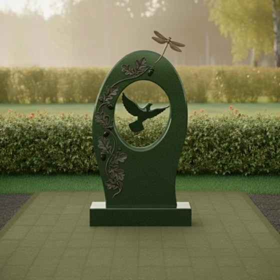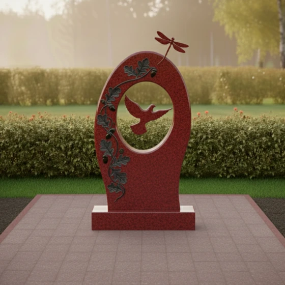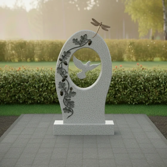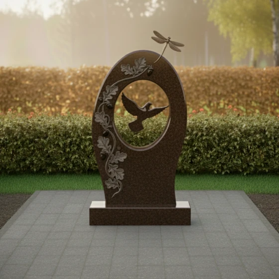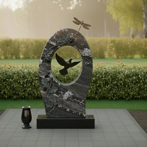 Гранитный монумент артикула ПН 496 — это не просто надгробный камень, а произведение искусства, созданное для того, чтобы увековечить светлую память о дорогом человеке. Его обтекаемая, почти эллиптическая форма, напоминающая мягкое объятие или символ бесконечности, словно раскрывает портал в мир воспоминаний. Центральное отверстие, выполненное в виде идеального овала, обрамляет собой глубоко вырезанный силуэт парящей птицы — символа души, устремляющейся ввысь, к покою и свободе. Эта птица, вырезанная с исключительной детализацией, выглядит так, будто вот-вот оторвется от камня и воспарит, наполняя композицию ощущением легкости и надежды.
