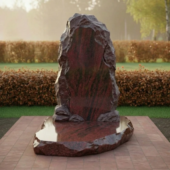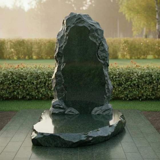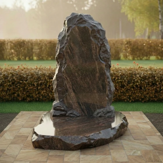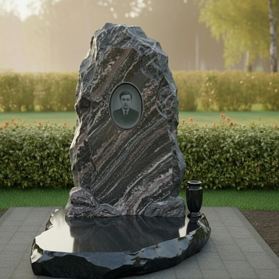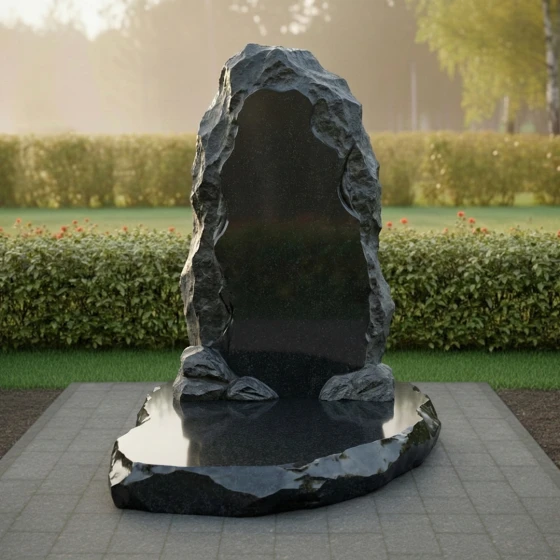 Основная идея данной модели заключается в имитации природной глыбы, словно только что извлеченной из недр земли. Лицевая сторона стелы представляет собой вертикально ориентированный массив, центральная часть которого подвергнута глубокой многостадийной полировке. Этот идеально ровный «остров» глади служит безупречным холстом для нанесения портрета, дат и эпитафии. Края же намеренно оставлены необработанными: сложная резьба воспроизводит хаотичный, скалистый рельеф с характерными сколами и выступами. Такая «рваная» фактура создает уникальный светотеневой рисунок, который меняется в зависимости от угла падения лучей, подчеркивая природное происхождение материала.