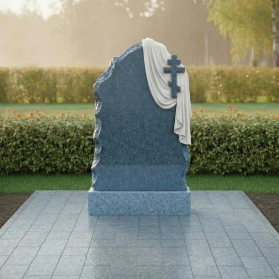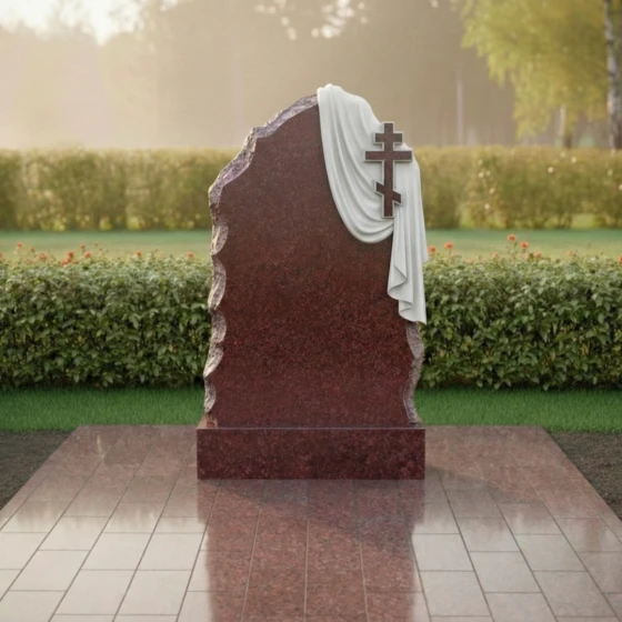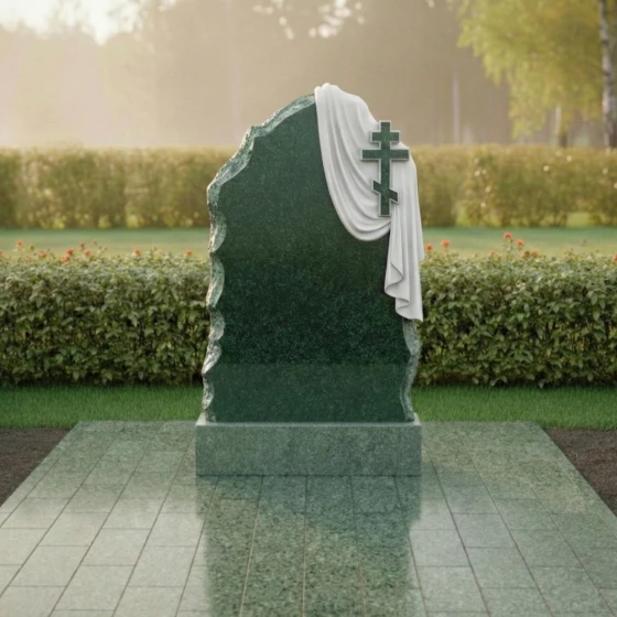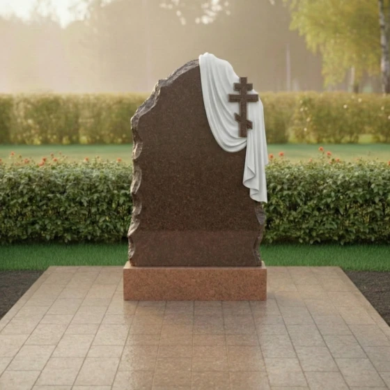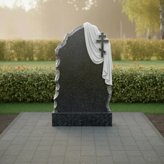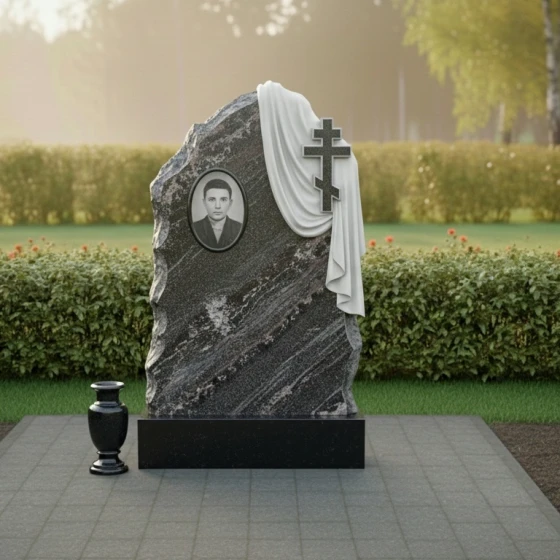 Особое внимание привлекает искусно вырезанная драпировка, ниспадающая с правой стороны мемориального камня. Её складки выглядят настолько реалистично, что кажется, будто легкое дуновение ветерка способно колыхнуть их. Этот элемент привносит в композицию ощущение нежности, скорби и утешения. На фоне светлой драпировки, выполненной в матовом срезе камня, выделяется строгий православный крест. Его лаконичные, но выразительные линии подчеркивают духовную значимость монумента, предлагая близким утешение в вере. Контраст между зеркальной полировкой основного камня, матовой резьбой драпировки и креста создает неповторимую фактуру, которая приглашает прикоснуться к камню, почувствовать его прохладу и гладкость.