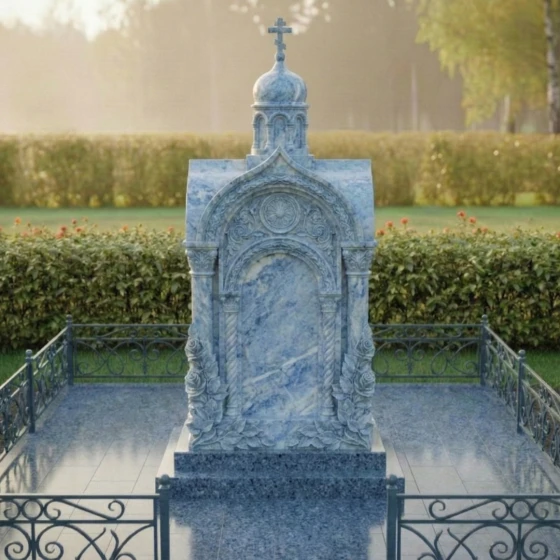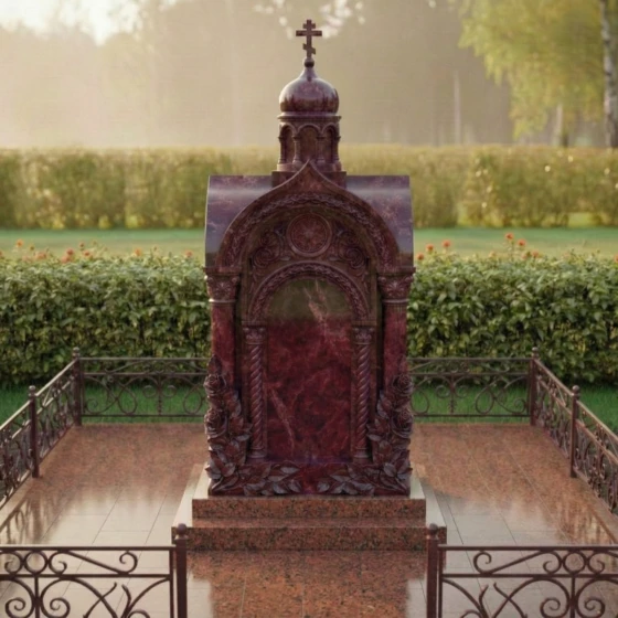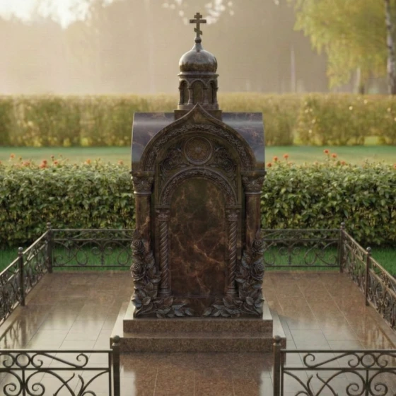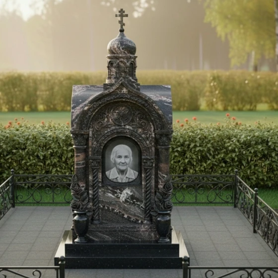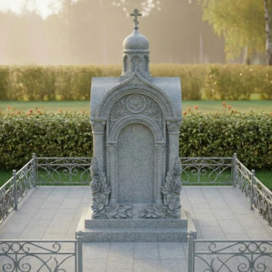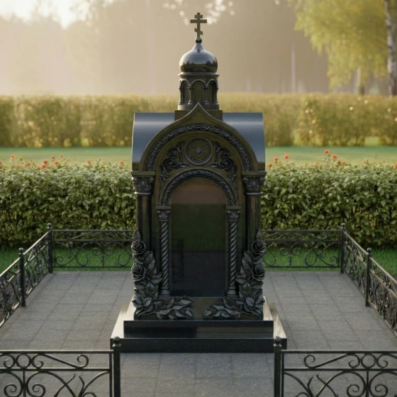 Представленный мемориальный ансамбль (Артикул 516) — это не просто дань памяти, а настоящее произведение высокого ритуального искусства, воплощенное в благородном камне. Величественная стела выполнена в архитектурном стиле православной часовни, что придает захоронению статусность и подчеркивает глубокую духовную связь с ушедшим близким. Центральное место композиции занимает глубокая ниша-арка, обрамленная изящными резными колоннами с винтовым орнаментом. Венчает монумент миниатюрный купол, на котором возвышается каноничный православный крест. Особое внимание приковывает к себе художественная резьба: у основания стелы «распускаются» объемные бутоны роз. Мастерски проработанные лепестки и пышная листва создают ощущение живой природы, застывшей в вечности. Контраст между зеркально отполированными плоскостями и матовой, бархатистой фактурой резных элементов создает неповторимую игру света и тени, делая монумент объемным и одухотворенным.