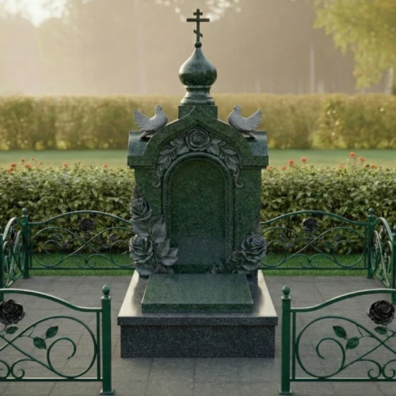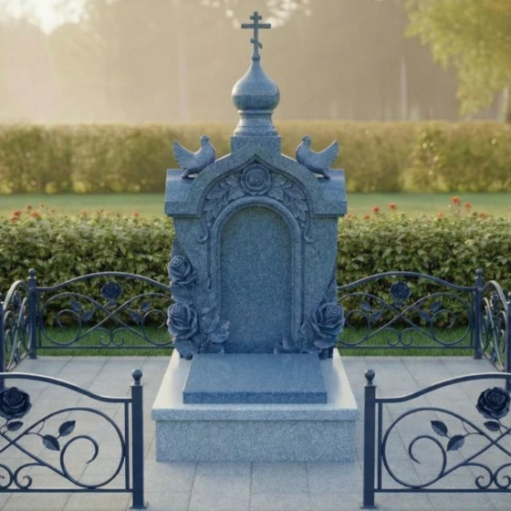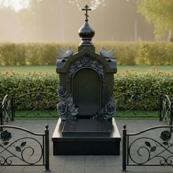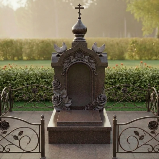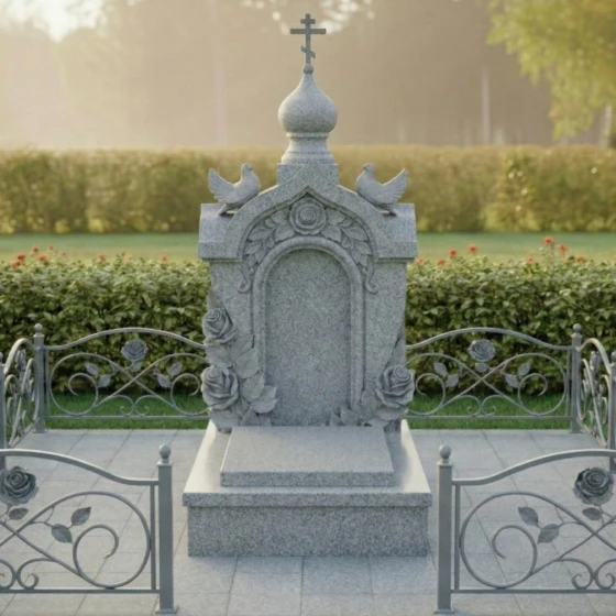 - Декоративное ограждение: Периметр участка может быть оформлен низкими гранитными столбиками, соединенными коваными элементами. Узор ограды, повторяющий мотив роз на стеле, создает гармоничное визуальное единство всего комплекса.