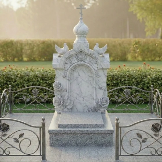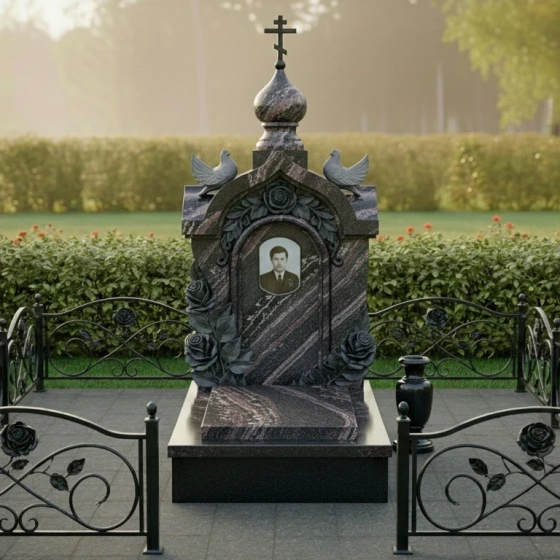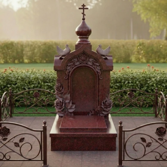 Надгробие из натурального камня под артикулом 517 представляет собой не просто мемориальный символ, а сложный архитектурный ансамбль, выполненный в лучших традициях православного зодчества. Данная модель выполнена в форме величественной часовни, увенчанной изящным куполом-маковкой с навершием в виде классического восьмиконечного креста. Строгие, но плавные линии арки создают глубокую нишу, которая служит идеальным обрамлением для портрета или памятной надписи. Каждое изделие проходит многоэтапную ручную обработку, что позволяет добиться исключительной детализации каждого элемента: от тонких перекладин креста до мягких изгибов купола.