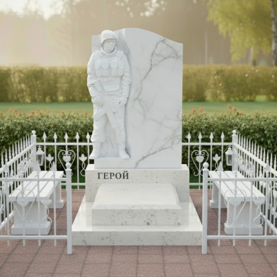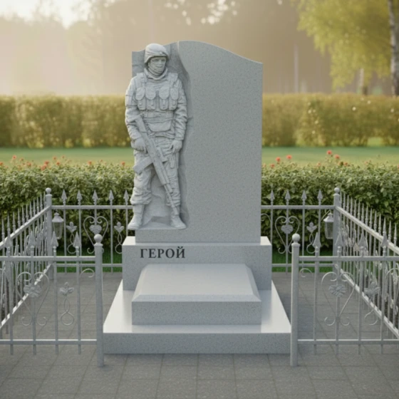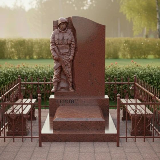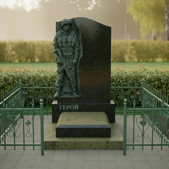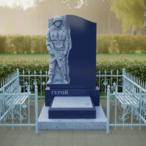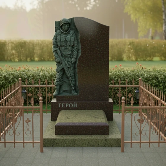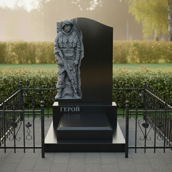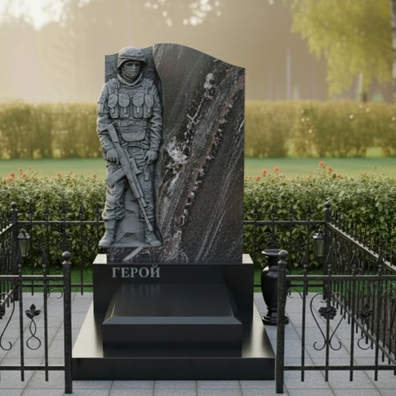 Данная модель представляет собой не просто надгробие, а глубоко проработанный художественный ансамбль, призванный увековечить память о человеке, посвятившем жизнь защите Родины. Главным акцентом композиции является искусно выполненный барельеф воина в полной тактической экипировке. Скульптурная резьба поражает своей детализацией: выверенные линии защитного шлема, фактура бронежилета, складки формы и реалистичное изображение оружия создают мощный образ мужества и стойкости. Ритуальное изделие построено на выразительном контрасте: фигура солдата выполнена в технике глубокой матовой резьбы, которая эффектно выделяется на фоне зеркально полированной поверхности основного камня. Это создает удивительную игру света и тени: в зависимости от угла зрения и освещения, силуэт защитника обретает дополнительный объем, словно выступая из монолита навстречу зрителю.