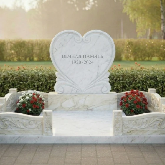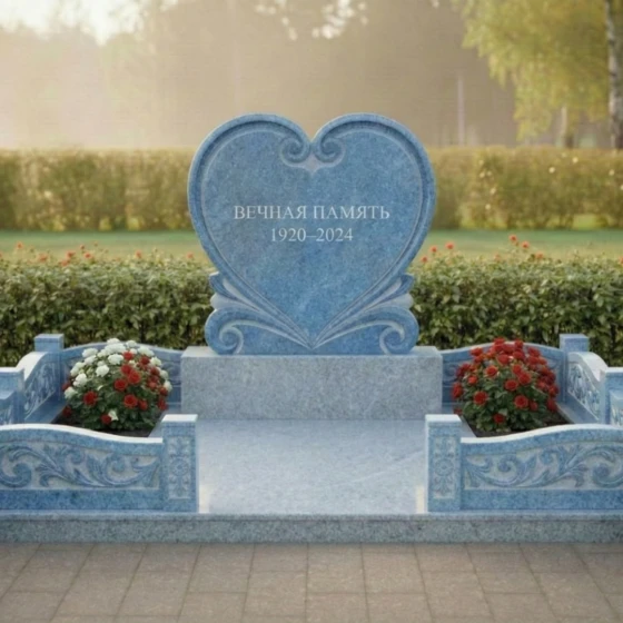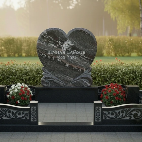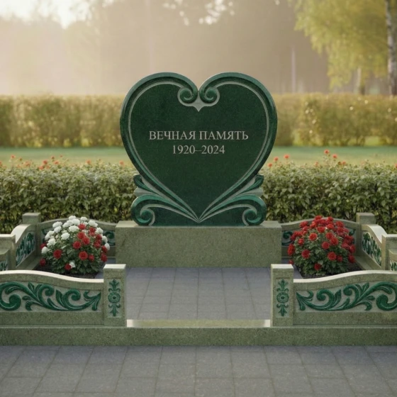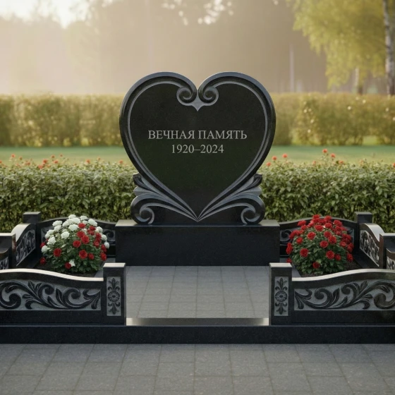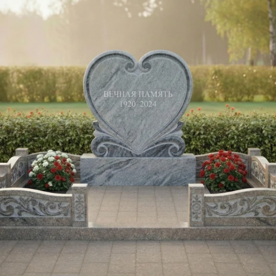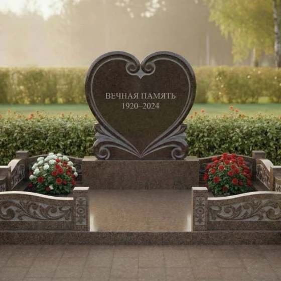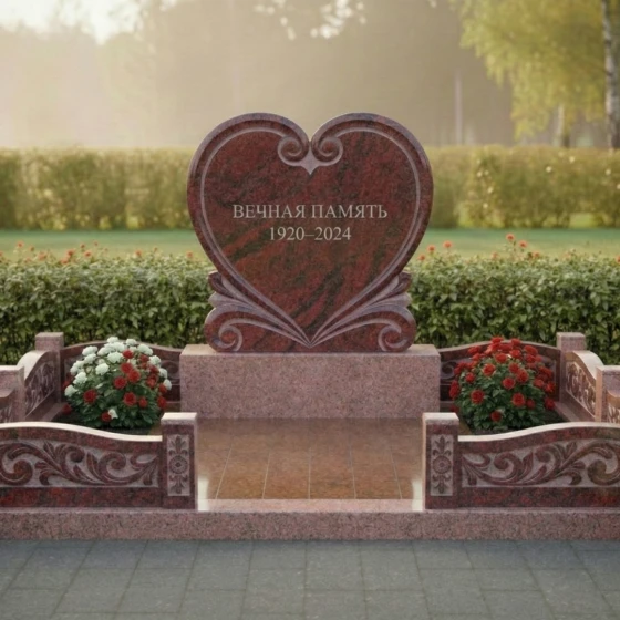 Форма сердца традиционно ассоциируется с бесконечной привязанностью и жизнью, которая продолжается в сердцах живых. Резные узоры, обрамляющие стелу и цоколь, символизируют древо жизни и циклическое обновление, подчеркивая веру в вечный покой души. Замкнутый контур каменного ограждения обозначает границы сакрального пространства, отделяя территорию вечности от суеты внешнего мира. Использование сплошного мощения участка плитами внутри цоколя не только придает композиции архитектурную целостность, но и гарантирует безупречный вид захоронения на десятилетия, исключая необходимость сложного ухода.