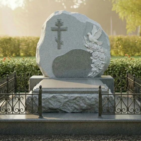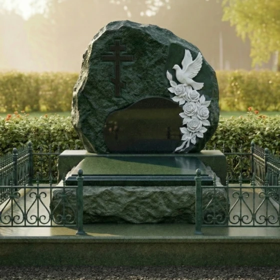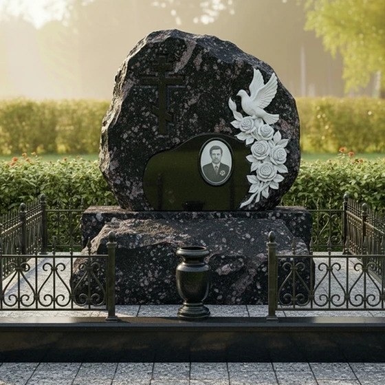 Эта величественная стела представляет собой уникальный художественный ансамбль, в котором первозданная мощь природного камня гармонично сочетается с изысканной ручной работой. Модель выполнена в стиле «скала»: ее внешние грани оставлены нарочито грубыми и необработанными, что символизирует вечность и незыблемость памяти, подобную древним утесам. В центре композиции находится идеально гладкий, зеркально отполированный островок, предназначенный для нанесения портрета и памятных слов. Особое внимание привлекает объемный барельеф: белоснежный голубь, застывший в полете, и пышные розы, чьи лепестки проработаны с исключительной детализацией. Фигура птицы олицетворяет чистоту души и мирный покой, а цветы подчеркивают неувядающую любовь близких. Контраст между матовой фактурой «рваного» камня и глубоким блеском центральной части создает глубокий визуальный объем, делая монумент заметным и статусным.