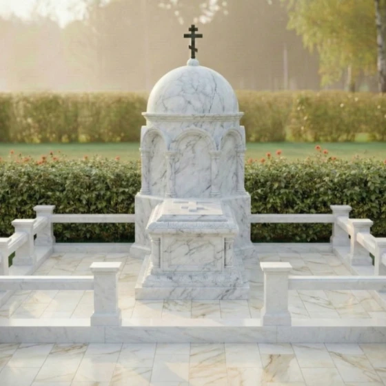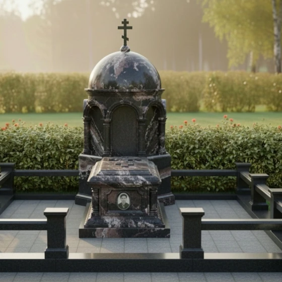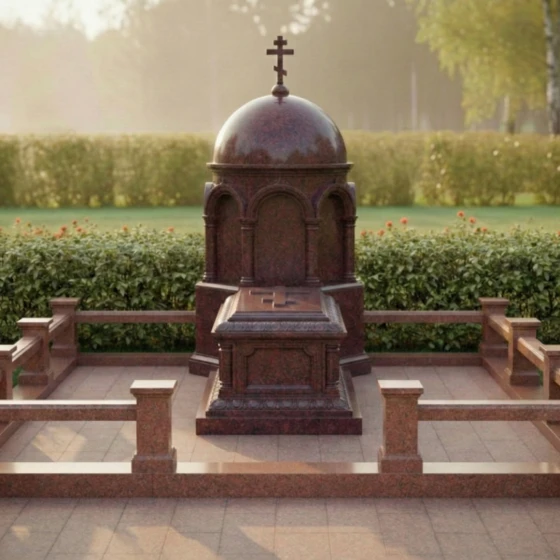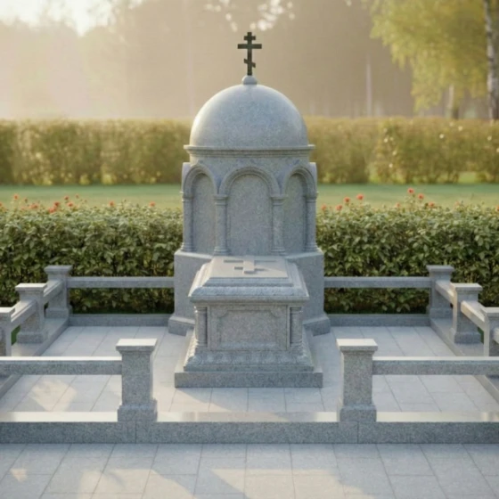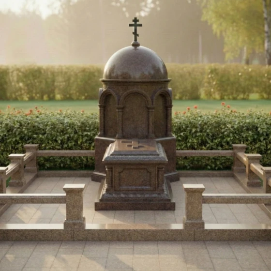 Геометрия данного памятника наполнена глубокими смыслами, понятными сердцу. Купольная форма традиционно символизирует небесный свод, под которым душа обретает долгожданный мир и покой. Плавные изгибы арок и мягкие переходы между ярусами олицетворяют бесконечность жизненного пути и торжество вечности над временным. Особое значение уделено благоустройству участка: массивный каменный цоколь, опоясывающий периметр, и строгие гранитные столбики-опоры создают четкие границы сакрального пространства. Такое решение не только придает эстетическую завершенность, но и надежно защищает покой усопшего от суеты внешнего мира, создавая атмосферу уединенности и торжественного безмолвия.