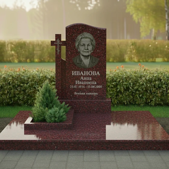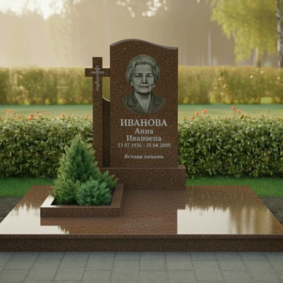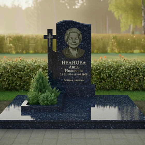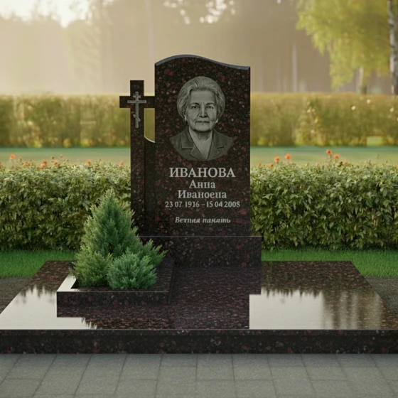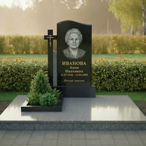 Художественная ценность изделия подчеркивается безупречной игрой фактур. Лицевая сторона памятника обладает зеркальной полировкой глубокого черного цвета, в которой, как в отражении души, застывает небо. Этот глянец контрастирует с матовыми, фактурными срезами камня на торцах и резных деталях креста. Подобный прием создает визуальный объем и делает конструкцию визуально более массивной и надежной. Гранитный монумент выглядит незыблемой крепостью, охраняющей покой близкого человека на протяжении столетий.