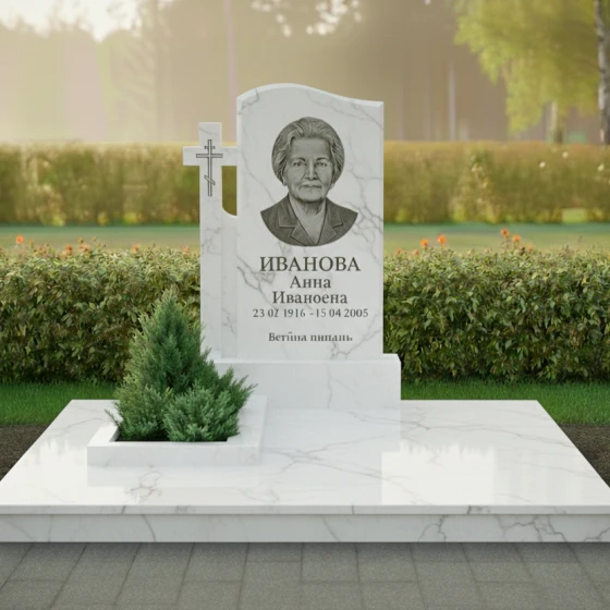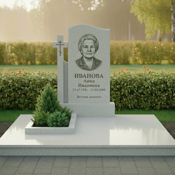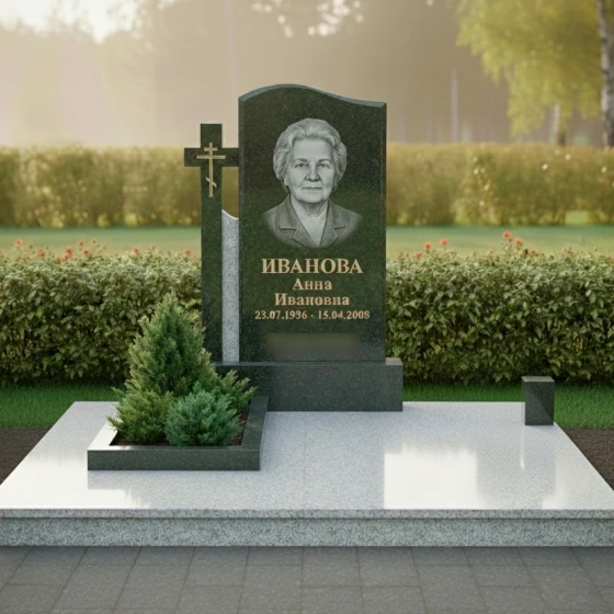 Оформление: Учитывая большую площадь полированной поверхности основного полотна, на этой модели идеально смотрится классический портрет в полный рост или крупное погрудное изображение. Гравировка ФИО и дат, выполненная золочением или глубоким пескоструйным методом, гармонично впишется в асимметричную форму памятника. Текст "Вечная память", нанесенный изящным курсивом в нижней части, станет финальным аккордом в этой симфонии скорби и любви.