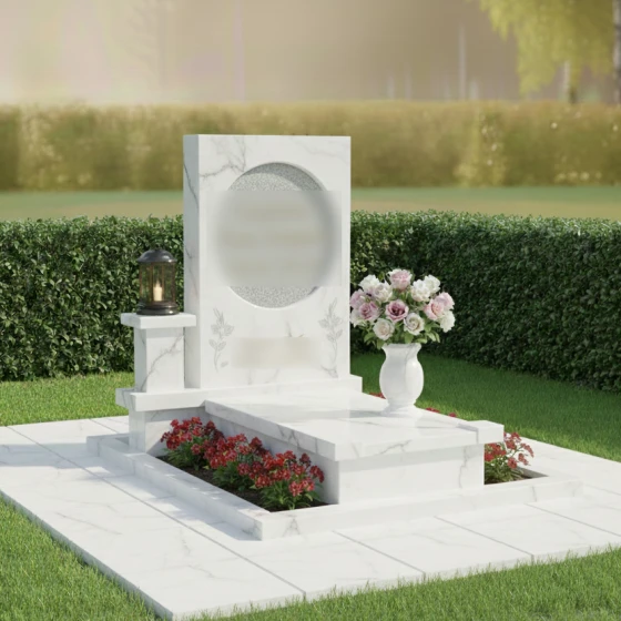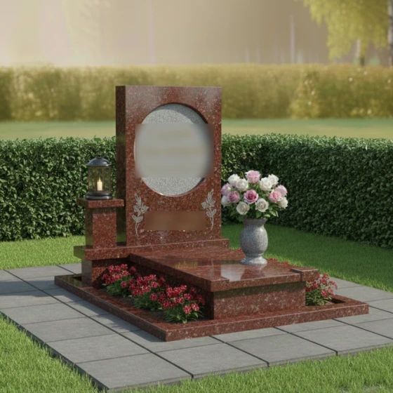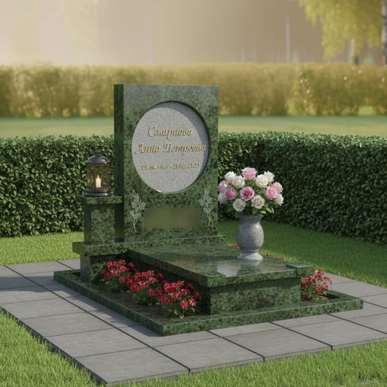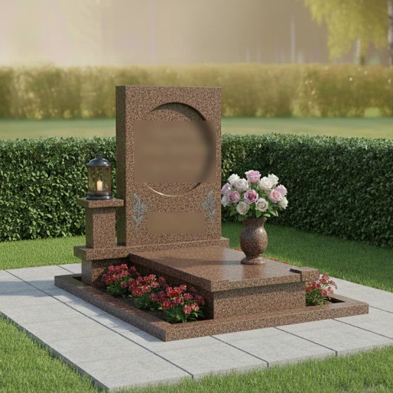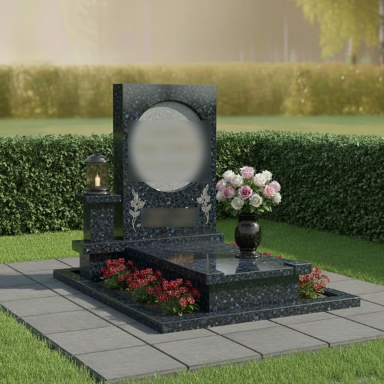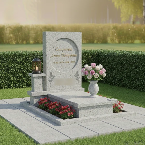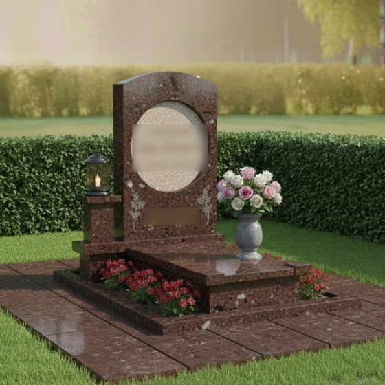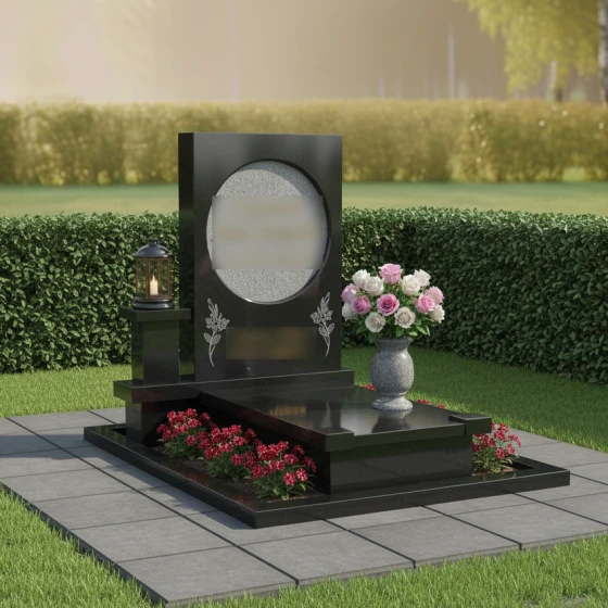Геометрия данного памятника идеально подходит для классического и художественного оформления. Круглый медальон служит естественной рамой для портрета, выполненного методом лазерной гравировки или на фотокерамике, придавая лицу особую одухотворенность. Строгие грани основного полотна позволяют гармонично расположить эпитафии и даты, сохраняя баланс между текстом и декором. Особое внимание в этой модели уделено благоустройству участка. Весь мемориальный комплекс установлен на высокий гранитный цоколь, который очерчивает границы участка, придавая ему законченный и монументальный вид. Горизонтальная надгробная плита полностью закрывает место захоронения, что не только подчеркивает архитектурную целостность, но и значительно упрощает уход за участком, исключая прорастание травы. Композиция дополнена функциональными деталями: отдельным каменным постаментом для лампады и изящной гранитной вазой для живых цветов, что превращает место памяти в благородный мемориал.