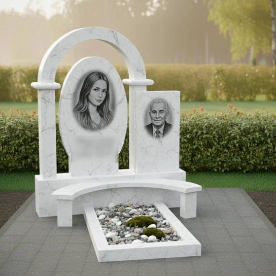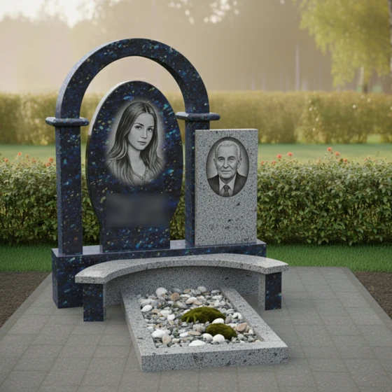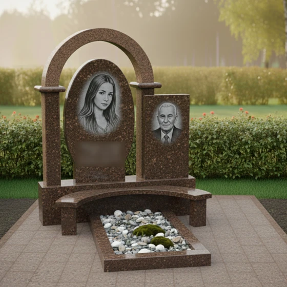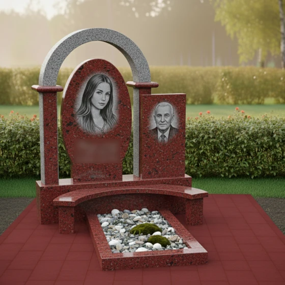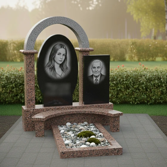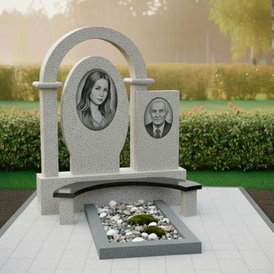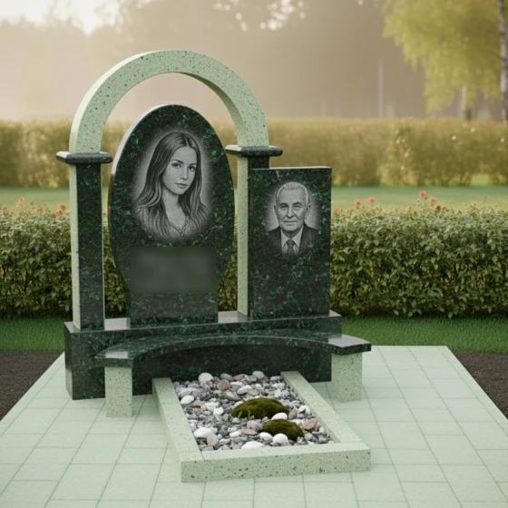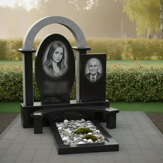 Геометрия мемориала продумана до мелочей: левая часть выполнена в форме совершенного овала, чьи мягкие контуры идеально подходят для глубокой художественной гравировки портрета. Правая стела имеет более строгие, классические очертания прямоугольника, создавая выразительный контраст форм. Особого внимания заслуживает игра фактур: зеркальная, глубокая полировка лицевых граней, в которых отражается мир, встречается с благородной матовостью резных элементов арки. Это создает уникальный визуальный объем, заставляя камень «дышать» при разном освещении. Завершает ансамбль изящная радиусная скамья, интегрированная непосредственно в основание комплекса. Она приглашает к тихому диалогу и размышлениям, становясь функциональным и эстетическим продолжением всего благоустройства.