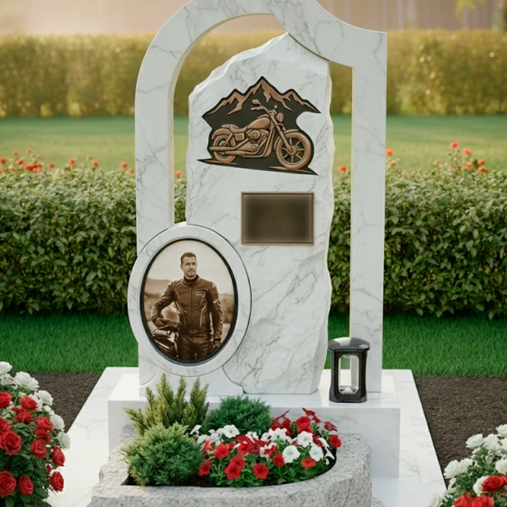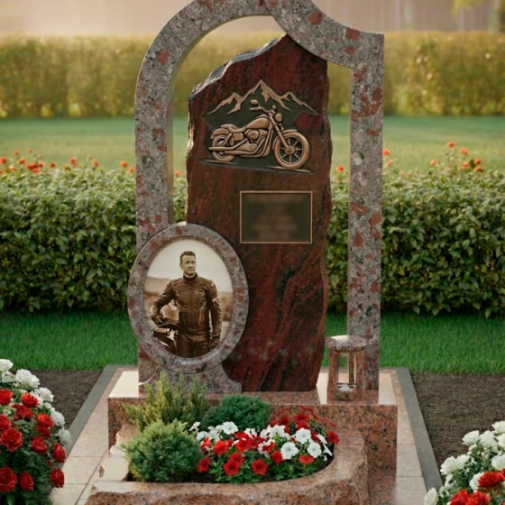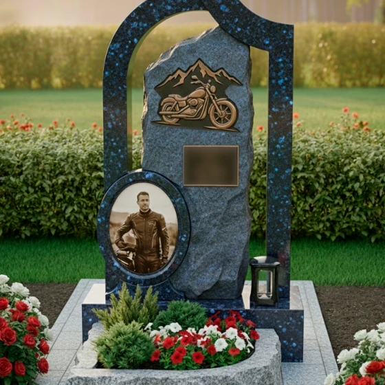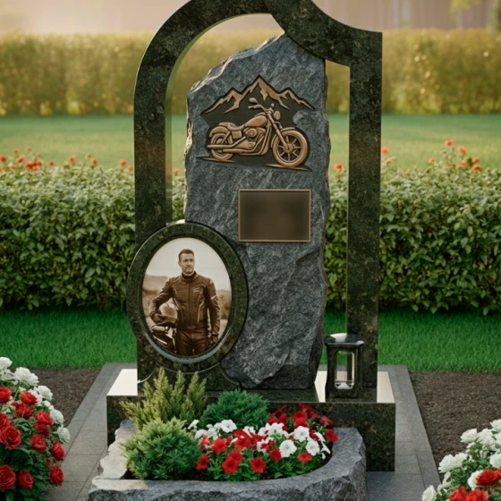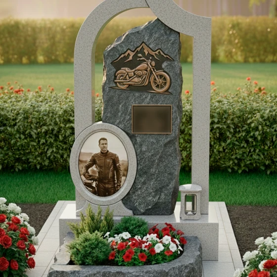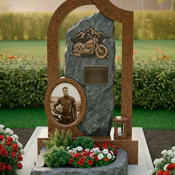 Оформление и рекомендации: Форма данного надгробия предполагает деликатный подход к персонализации. Овальный медальон в нижней части идеально подходит для классического фотокерамического портрета или гравировки на стекле, что добавит композиции глубины. Для нанесения имени и дат рекомендуется использовать накладную бронзовую табличку или рельефные буквы, которые будут гармонировать с барельефом мотоцикла. Текстура «Скала» сама по себе является мощным декоративным элементом, поэтому надписи лучше располагать на специально подготовленных полированных участках, чтобы сохранить читаемость и эстетическую чистоту дизайна.