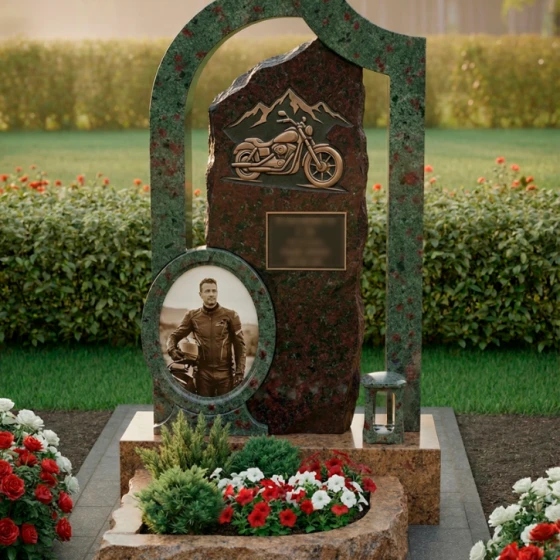Представленный гранитный монумент (артикул 612) является истинным произведением мемориальной архитектуры, в котором гармонично соединились суровая мощь первозданной природы и совершенство современных линий. Основная концепция данной модели строится на эстетике контрастов: внешнее обрамление выполнено в виде высокой, идеально отполированной арки, чьи плавные изгибы символизируют бесконечный жизненный цикл и небесный свод. Внутри этого защитного контура расположено центральное полотно с фактурой «Скала» — грубый, необработанный скол камня, олицетворяющий твердость характера и стойкость духа. Центром композиции является объемный барельеф: мотоцикл на фоне горных вершин, что подчеркивает свободолюбивую натуру и страсть к движению, запечатленную в камне навсегда. Изящная овальная рамка в нижней части обелиска предназначена для портрета, создавая интимную зону памяти, защищенную величием архитектурных форм.