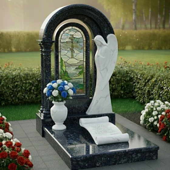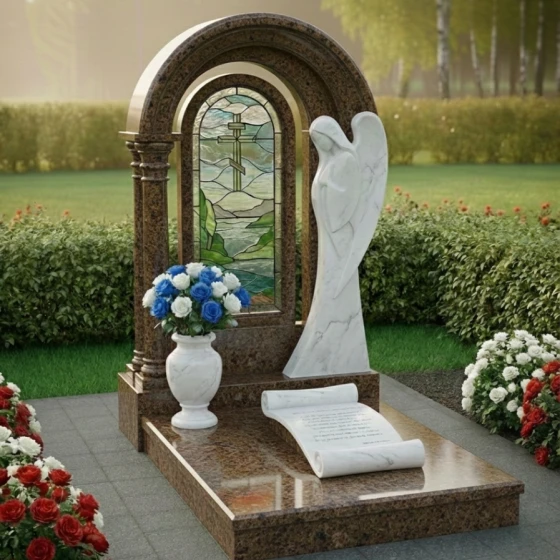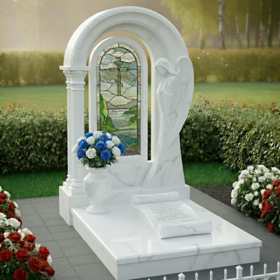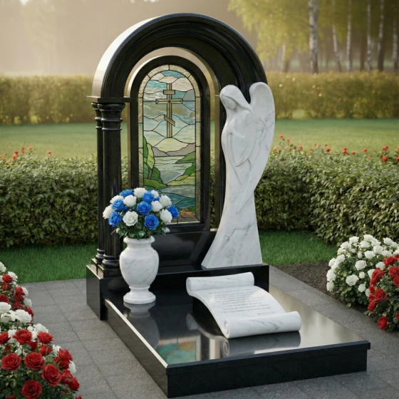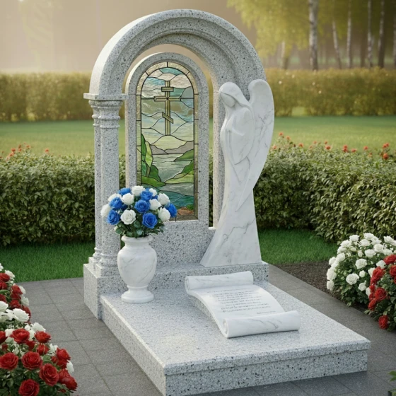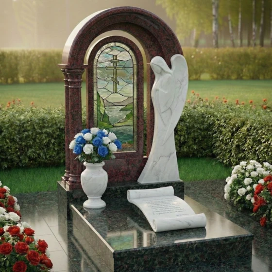 Кому подойдет: Данная мемориальная композиция станет идеальным выбором для оформления женского или семейного захоронения, где важно подчеркнуть нежность, чистоту и духовную связь. Благодаря своей сложности и наличию скульптурных элементов, этот ансамбль выбирают для создания эксклюзивных мемориальных комплексов на кладбищах европейского типа, где ценится эстетика, индивидуальный дизайн и безукоризненное качество исполнения каждой детали.