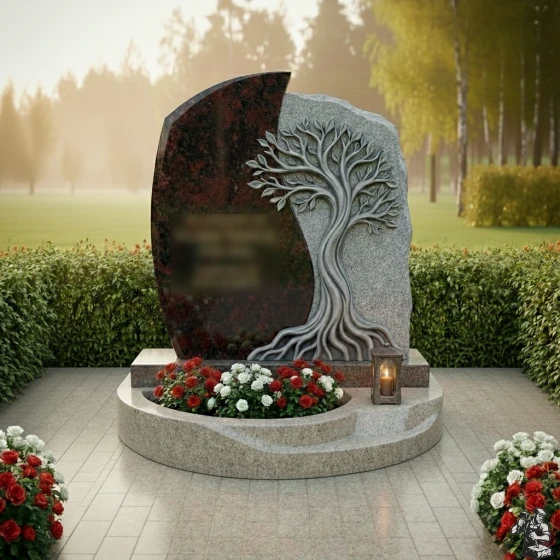 Центральным элементом композиции выступает сложное сочетание двух фактур. Левая часть памятника выполнена в виде изящного полотна с идеальной зеркальной полировкой, чей глубокий блеск символизирует чистоту души и ясность памяти. Правая часть представляет собой искусно вырезанное древо — мощный барельеф, буквально «вырастающий» из необработанной скальной поверхности. Резьба поражает своей детализацией: корни дерева крепко охватывают основание камня, уходя вглубь, а раскидистая крона с множеством тщательно проработанных лепестков устремлена вверх. Плавный изгиб, разделяющий полированную плоскость и резной декор, олицетворяет жизненный путь — порой тернистый, но неизменно стремящийся к свету.