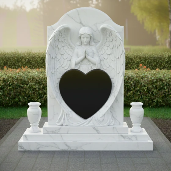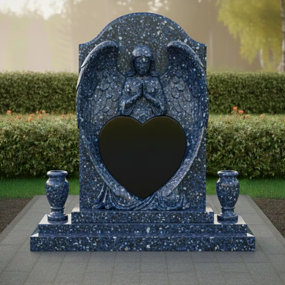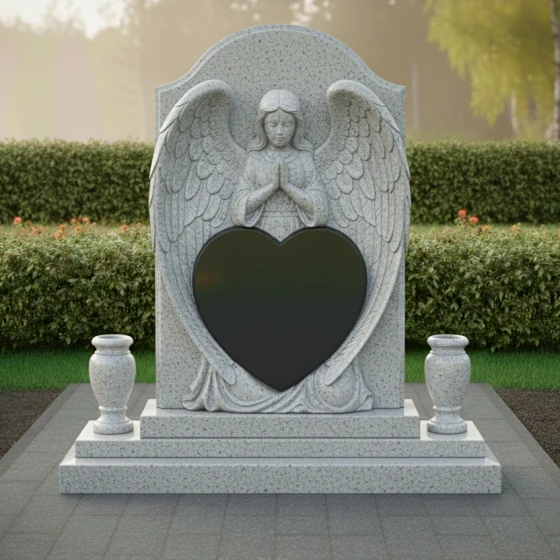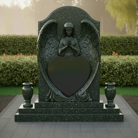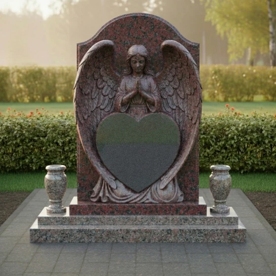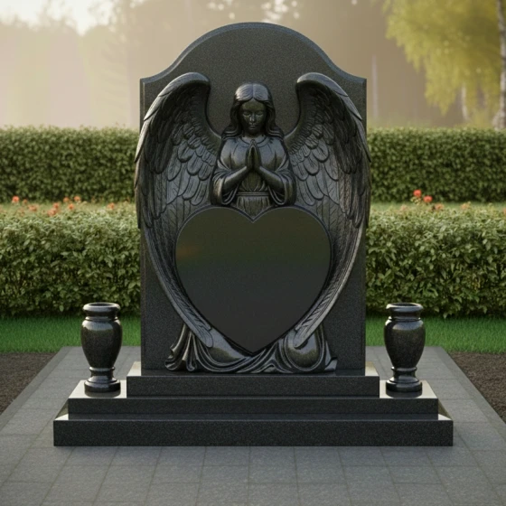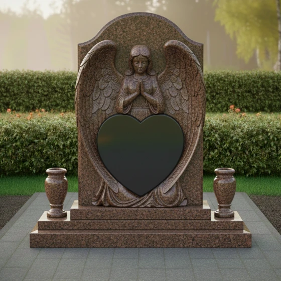 Представленный гранитный монумент (Артикул 615) — это не просто надгробие, а подлинное произведение мемориальной пластики, в котором застыло глубокое чувство скорби и бесконечной нежности. Центральным элементом композиции является величественная фигура молящегося ангела. Мастерски выполненная резьба передает каждую деталь: кроткий лик небесного покровителя, сложенные в молитве руки и, самое впечатляющее, — монументальные крылья. Перья проработаны с ювелирной точностью, создавая объемную, почти живую фактуру, которая контрастирует с идеально гладким основанием. Крылья ангела бережно обрамляют крупное сердце — главный смысловой центр изделия, предназначенный для сохранения облика дорогого человека.