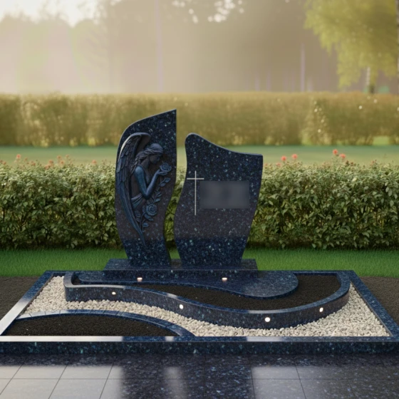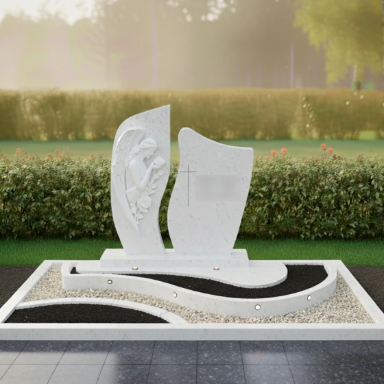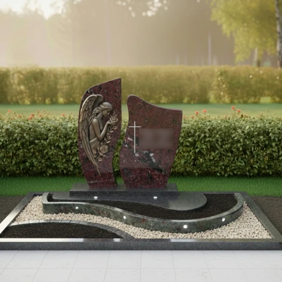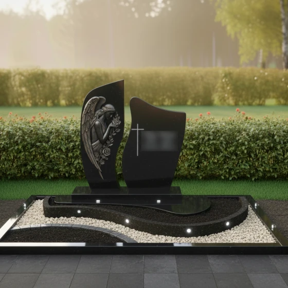 Каждая деталь этой модели наполнена глубоким смыслом. Ангел — это символ защиты, посредник между земным и небесным мирами, оберегающий покой усопшего. Роза в его руках традиционно олицетворяет чистоту души и вечную любовь, которая не увядает с годами. Асимметричная форма стелы и волнообразные линии в оформлении цветника напоминают о быстротечности времени и одновременно о его непрерывности. Сочетание строгой геометрии основания и мягких изгибов барельефа создает ощущение гармонии, даря утешение близким и подчеркивая статус мемориала как исключительного произведения ритуального искусства.
