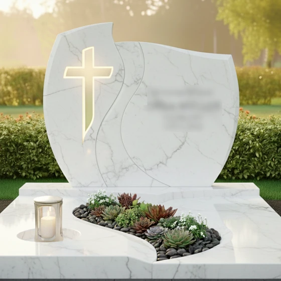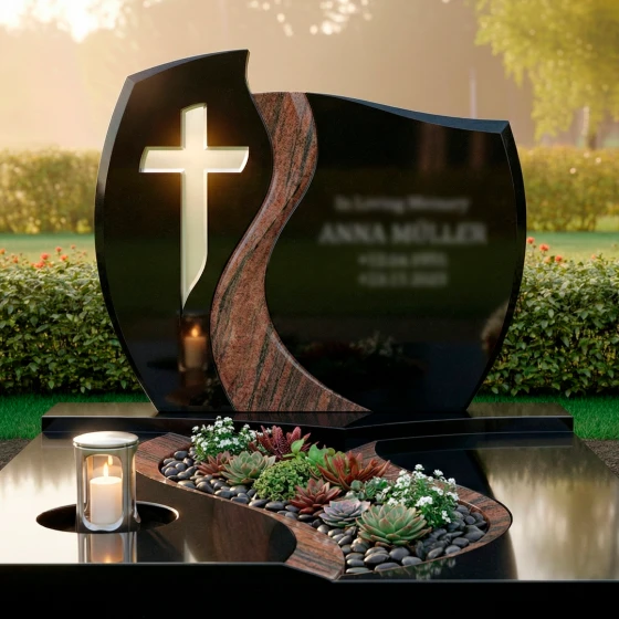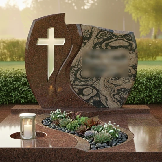 Визуальное решение стелы строится на гармоничном союзе двух асимметричных элементов, разделенных динамичным, плавным изгибом. Эта резная «волна», проходящая сквозь всё полотно камня, создает эффект движения и легкости, несмотря на значительный вес монумента. Левая часть композиции акцентирована лаконичным прорезным крестом, выполненным с идеальной геометрической точностью. Глубокая фаска по внутреннему контуру креста создает игру света и тени, придавая символу веры объем и визуальную значимость.