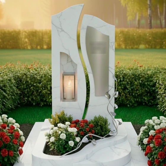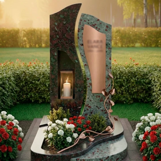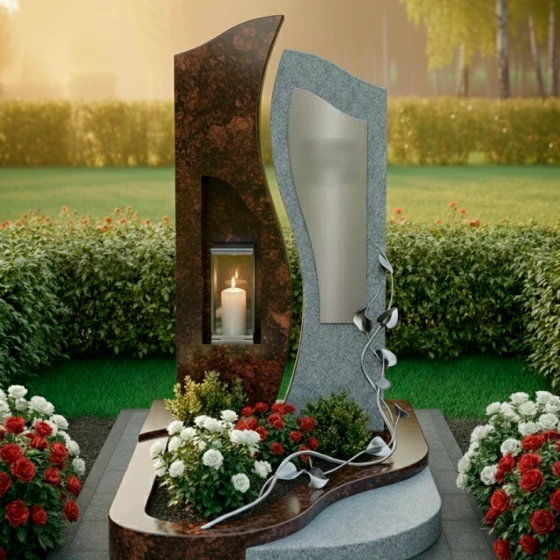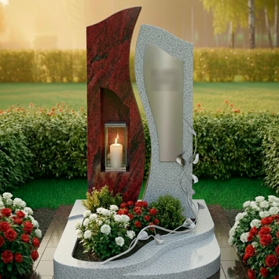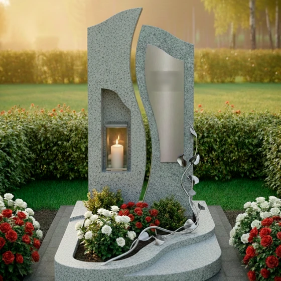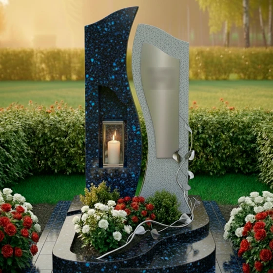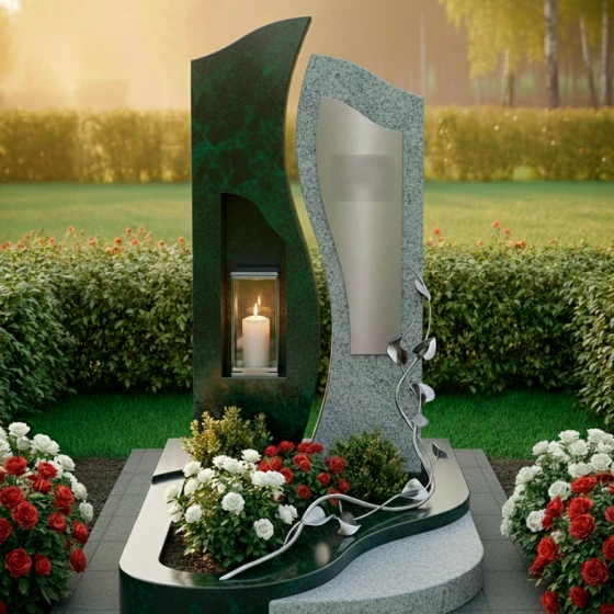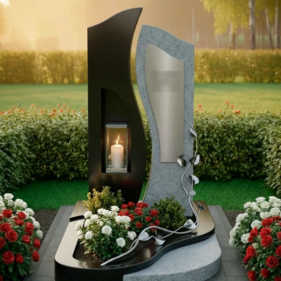 Центральным элементом ансамбля выступает величественная сдвоенная стела, выполненная в стиле европейского модерна. Левая часть монумента, обладающая строгой вертикалью и глубокой зеркальной полировкой, олицетворяет незыблемость памяти и твердость духа. В её теле искусно вырезана глубокая ниша, в которой располагается защищенная стеклом лампада. Этот элемент превращает монумент в сакральный алтарь: свет свечи, отражаясь в черном глянце, создает эффект бесконечного сияния, символизируя вечную жизнь души. Правая часть стелы имеет более мягкие, волнообразные очертания и выполнена из камня контрастного светлого оттенка с благородной мелкозернистой фактурой. На её поверхности установлена изящная металлическая вставка, предназначенная для нанесения портрета или эпитафии.