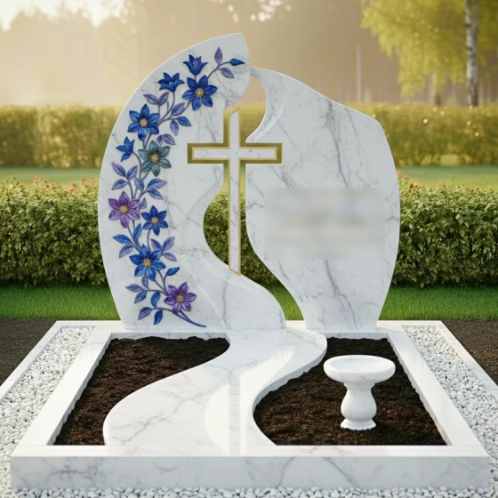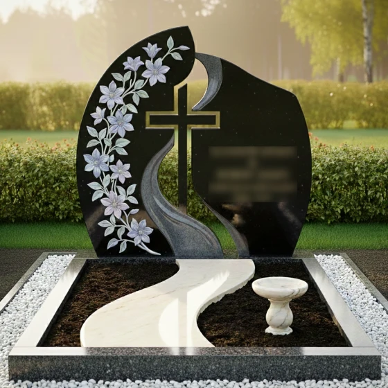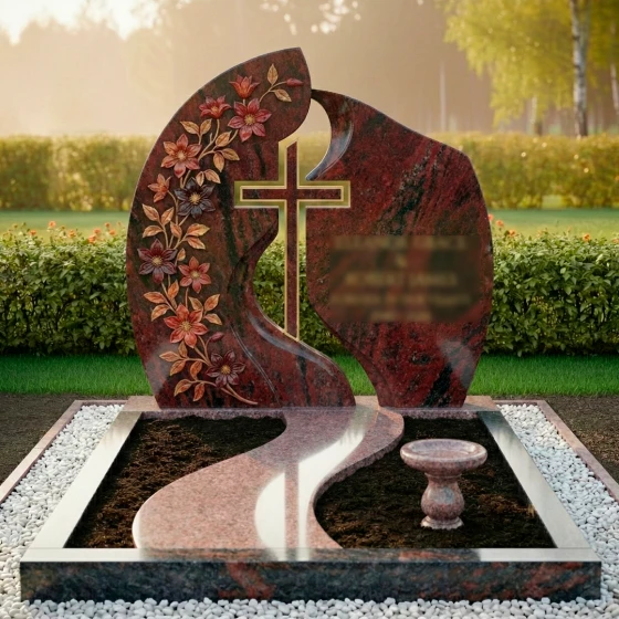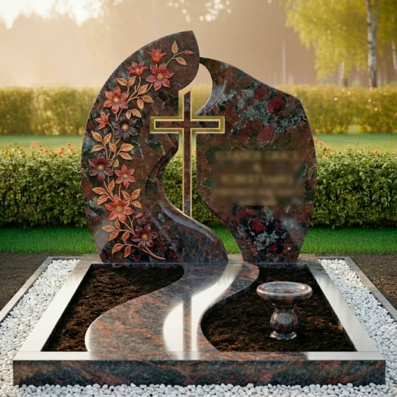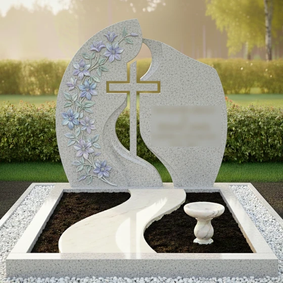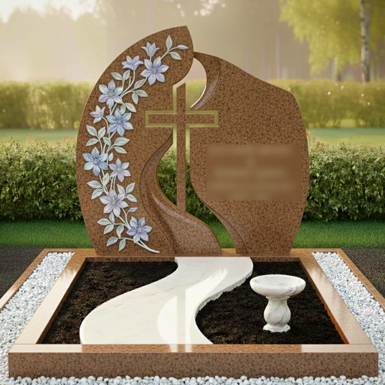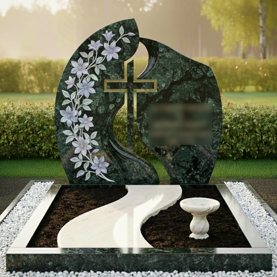 Кому подойдет: Данная модель станет идеальным выбором для оформления женского захоронения — матери, жены, сестры или дочери. Плавные линии, обилие цветочного декора и общая легкость конструкции подчеркивают женственность и душевную теплоту, оставляя в памяти светлый и благородный образ. Благодаря возможности исполнения в разных цветах, этот ансамбль также может быть адаптирован для семейного мемориала, если необходимо подчеркнуть эстетическую тонкость и художественный вкус семьи.