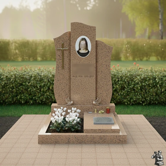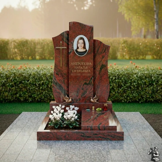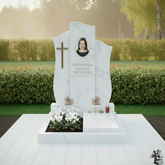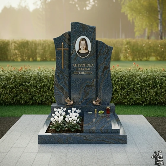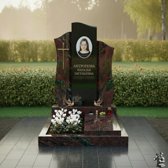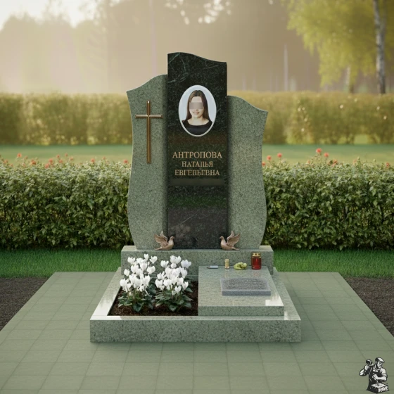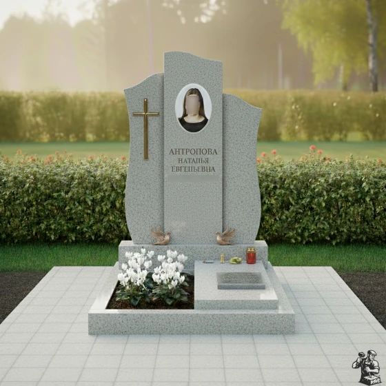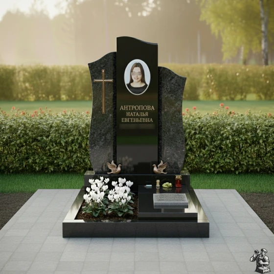 Особое внимание притягивают детали ручной художественной отделки. На левом крыле ансамбля расположен изящный, лаконичный золоченый крест — символ веры и духовного восхождения. Его тонкий профиль контрастирует с мощью гранитного массива, привнося в общую стилистику нотки легкости. В нижней части стелы установлены две литые фигуры голубей в бронзовом исполнении. Птицы, замершие у подножия камня, кажутся одухотворенными стражами покоя, а детальная проработка их оперения придает мемориалу особую эстетическую ценность.