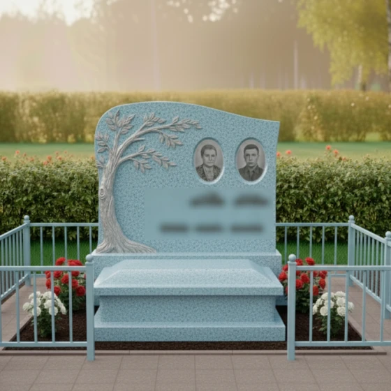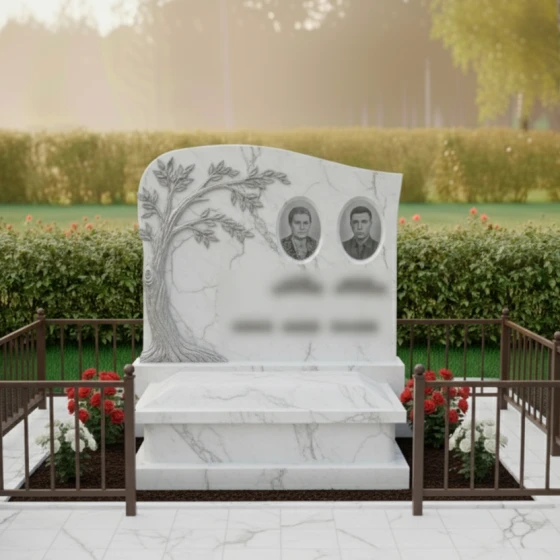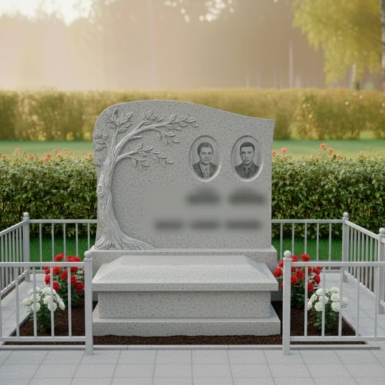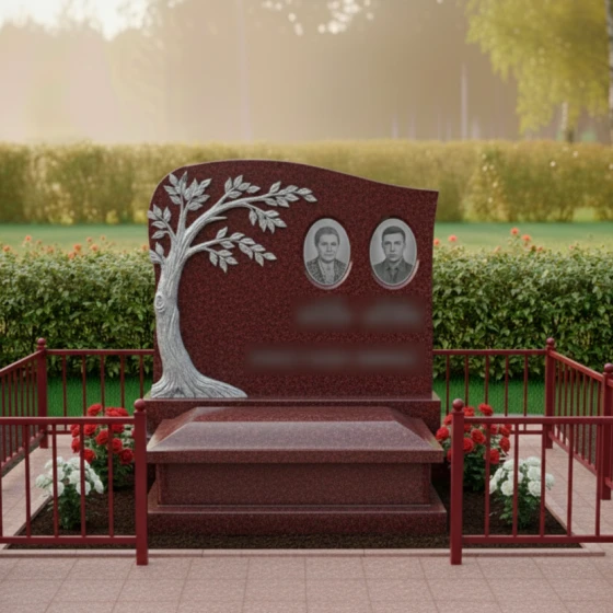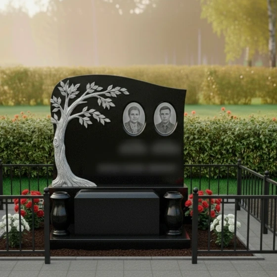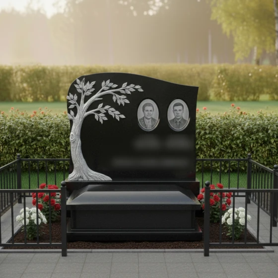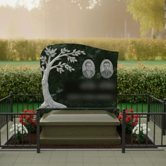 Портреты на этой стеле располагаются в верхней правой части, уравновешивая массивную резную фигуру дерева слева. Такое композиционное решение направляет взгляд зрителя от символа вечности к ликам дорогих людей. Дополнительную торжественность композиции придает каменный цоколь по периметру, который четко очерчивает границы мемориального пространства, создавая защищенную и уединенную зону памяти.