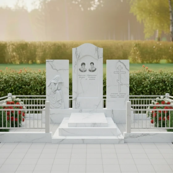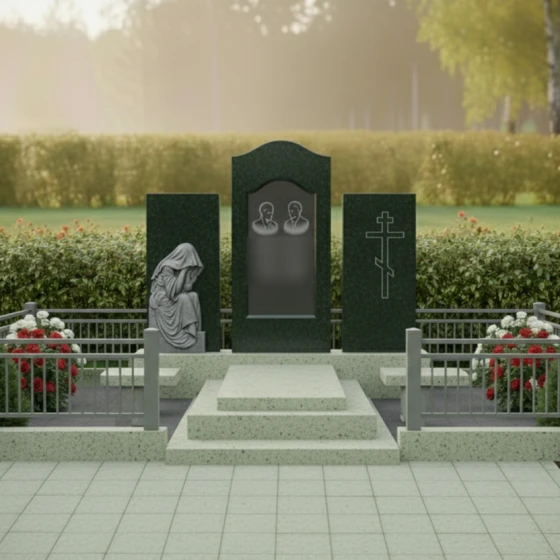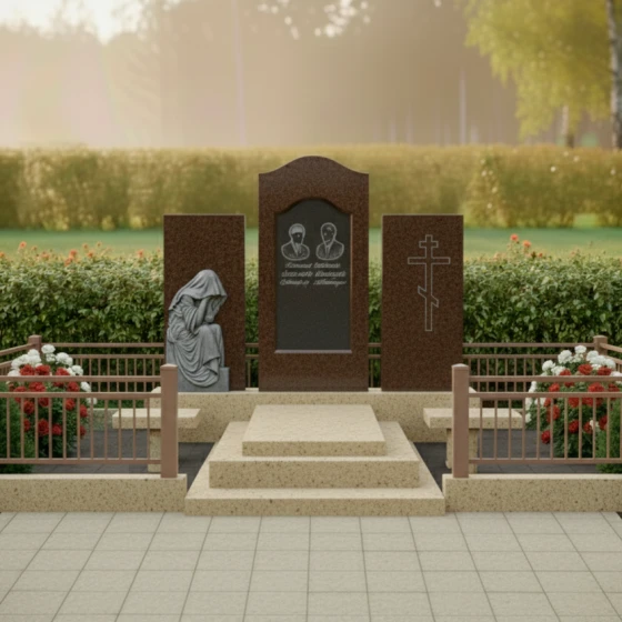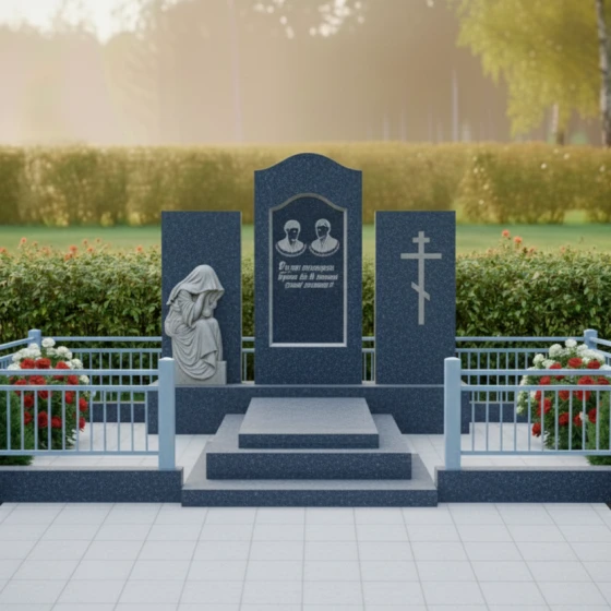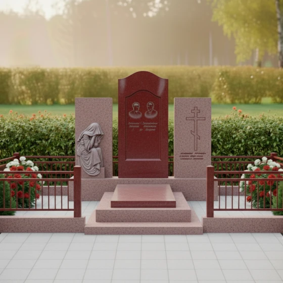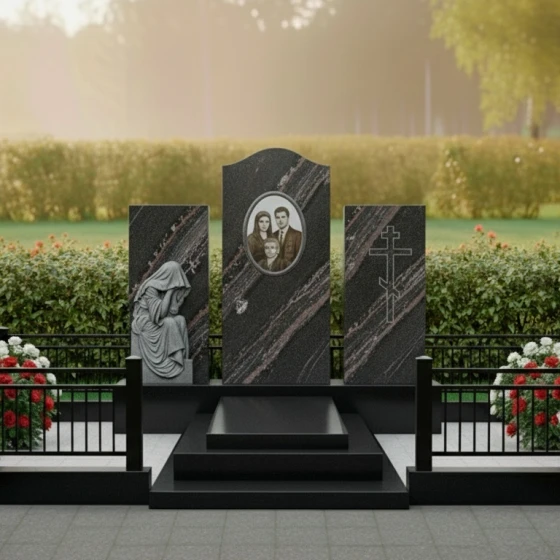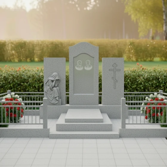 В основе композиции лежит безупречная симметрия и архитектурная выверенность. Центральное место занимает вертикальная стела с мягким арочным навершием, напоминающим небесный свод или портал в вечность. По бокам от неё расположены два дополнительных гранитных блока, каждый из которых несет свою художественную нагрузку. Левая часть украшена детально проработанной скульптурой «Скорбящей матери». Мастерски исполненная резьба передает каждую складку ниспадающей плащаницы, создавая эффект мягкой ткани, застывшей в камне. Фигура, склоненная в тихой печали, привносит в ансамбль особую человечность и эмоциональную глубину.