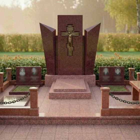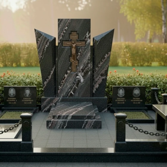 Кому подойдет: Данный мемориальный ансамбль является идеальным выбором для оформления семейного захоронения (на три или четыре человека). Благодаря своей монументальности и сложной архитектурной форме, он подходит для почтения памяти главы семьи или уважаемого человека, чья жизнь была примером крепости духа и верности традициям. Это решение для тех, кто ищет не просто памятник, а долговечный символ родовой памяти, который сохранит свою величественность для многих последующих поколений.