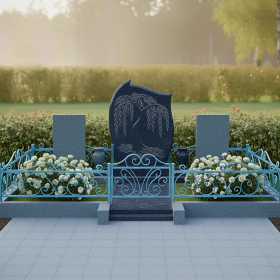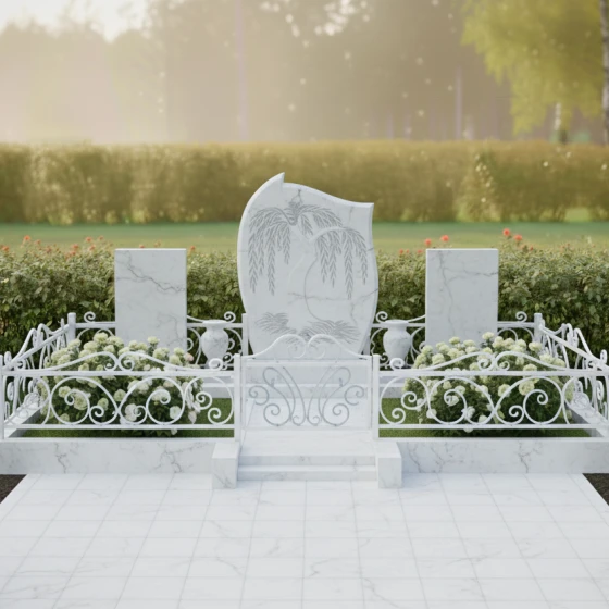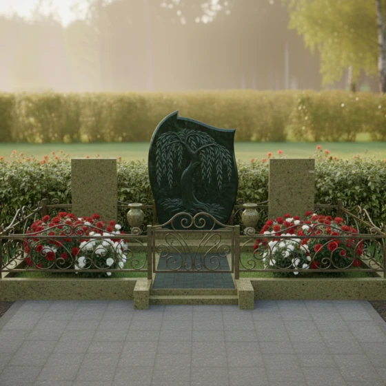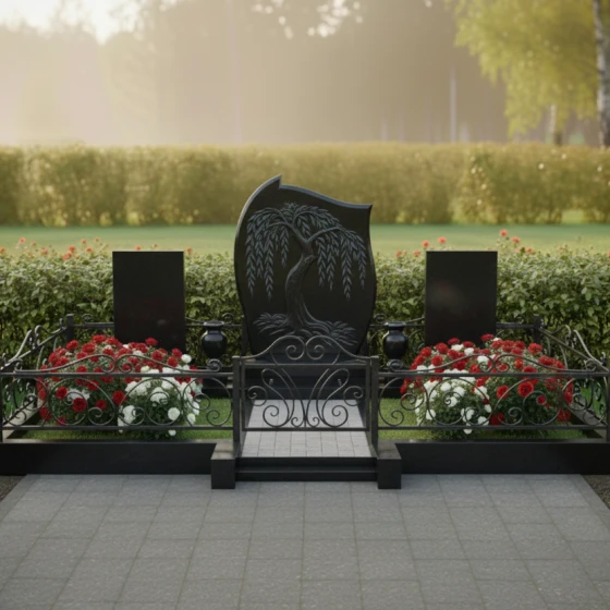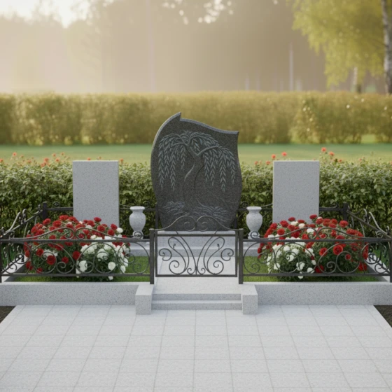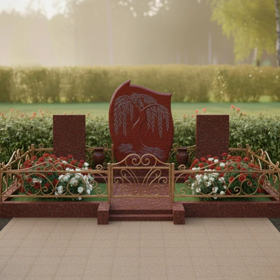 Кому подойдет: Это архитектурное решение идеально для оформления родового или семейного захоронения на трех человек. Благодаря сочетанию плавных изгибов центральной стелы и строгих линий боковых элементов, монумент выглядит универсально — он одинаково уместен как для выражения скорби по женщине (через мягкие формы и символику ивы), так и для почитания памяти мужчин, чья жизнь была опорой семьи. Мемориальная композиция станет достойным символом преемственности поколений и вечной памяти, воплощенной в благородном камне.