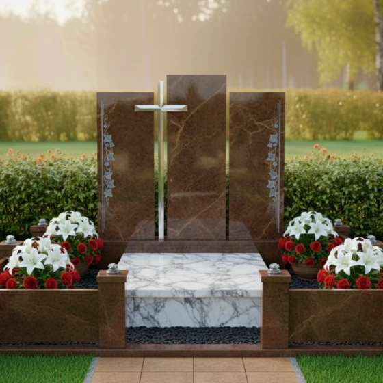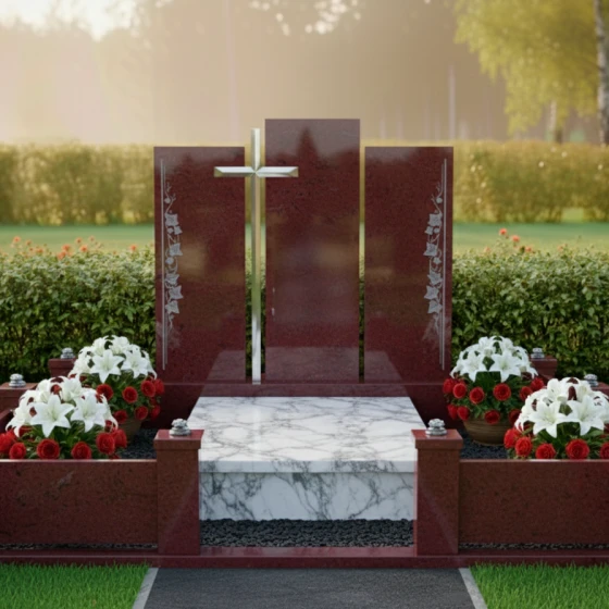 Особое внимание привлекает четырехконечный крест, который словно пронзает плоскость камня. Он выполнен в лаконичном стиле с акцентированными гранями, создающими игру света и тени, что придает распятию объем и визуальную легкость. На боковых стелах методом художественной гравировки нанесен растительный орнамент. Изящные ветви с детально проработанными листьями и бутонами цветов создают мягкий эстетический контраст с массивными каменными блоками, символизируя вечное цветение жизни в памяти потомков.