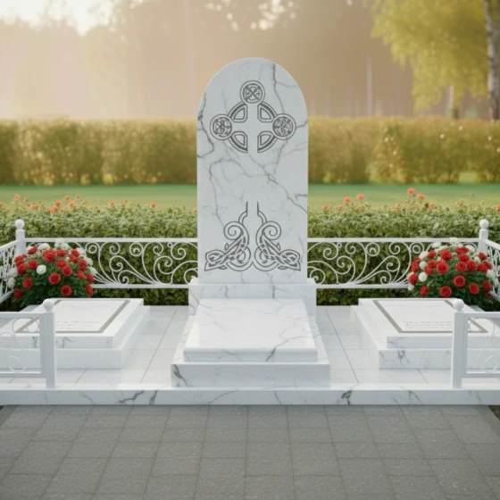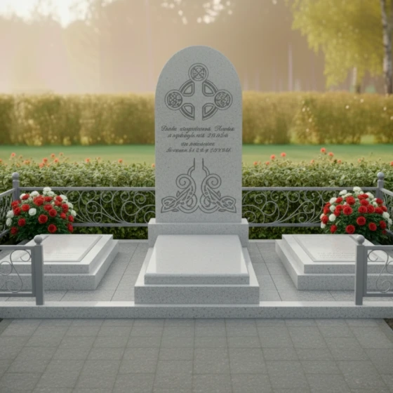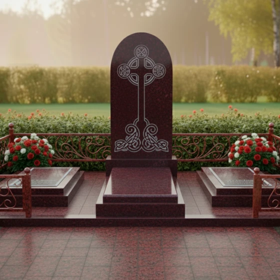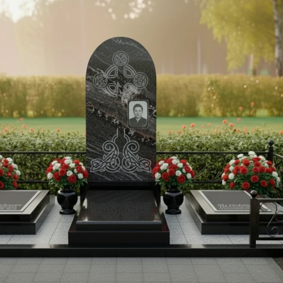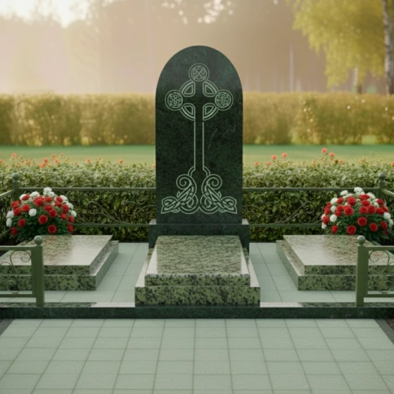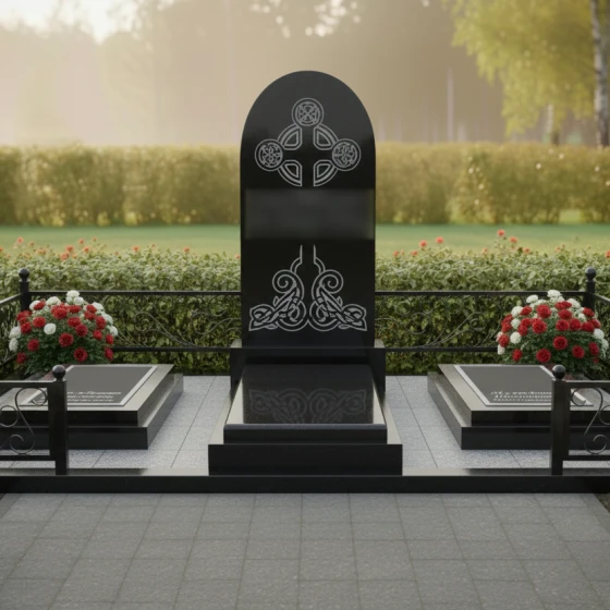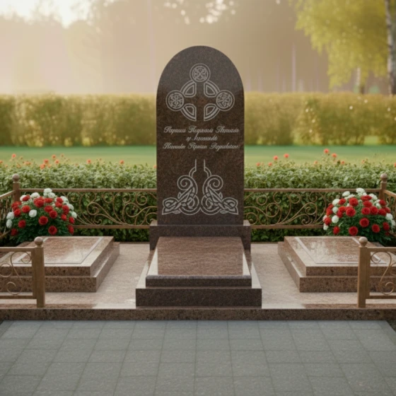 Форма арки в ритуальной архитектуре традиционно символизирует переход в лучший мир и небесное покровительство. Кельтская символика, использованная в оформлении, олицетворяет бесконечность бытия и неразрывную связь между прошлым и будущим. Массивное основание и закрытые надгробные плиты создают ощущение защищенности и вечного покоя. Этот ансамбль идеально подходит для семейного захоронения на трех человек, подчеркивая единство рода и незыблемость семейных уз, которые не способна разорвать даже смерть.