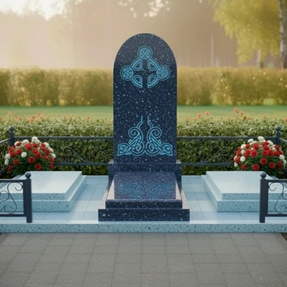 Центральным элементом композиции является высокая вертикальная стела с изящным арочным завершением. Купольный свод верхушки придает памятнику торжественный и в то же время умиротворяющий вид, напоминая очертания церковных врат. Особого внимания заслуживает художественное оформление: в верхней части фасада выгравирован сложный кельтский крест, заключенный в орнаментальный круг. Каждая линия этого символа выполнена с ювелирной точностью, создавая эффект объемного плетения. В нижней части стелы расположен симметричный декоративный узор, напоминающий переплетенные ветви или старинный герб, что придает изделию аристократизм.