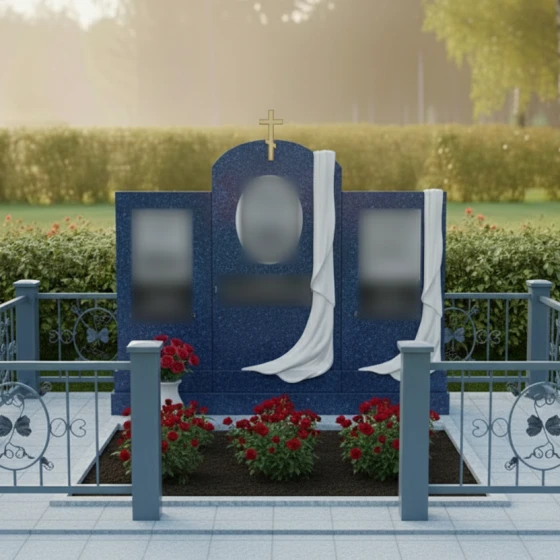 В основе ансамбля лежит классический триптих, состоящий из доминирующей центральной стелы с изящным арочным завершением и двух симметричных боковых крыльев строгой прямоугольной формы. Главным акцентом, приковывающим взгляд, является искусно выполненная художественная драпировка — белоснежная плащаница. Резчики по камню с филигранной точностью передали мягкость ниспадающей ткани, её глубокие складки и естественный объем, который создает поразительный контраст с идеально гладкой, зеркальной полировкой основного монумента.