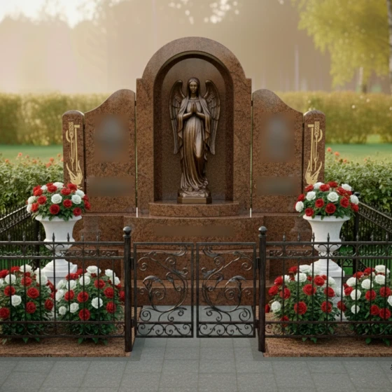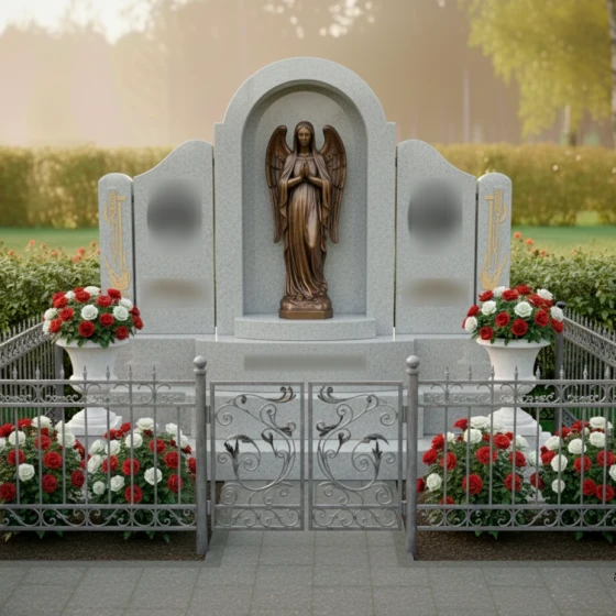 Этот мемориал задуман как законченное архитектурное решение. Монумент установлен на мощный многоуровневый постамент, который визуально приподнимает композицию, придавая ей особую торжественность. В состав комплекса входят две классические белоснежные вазы, установленные на собственных пьедесталах. Они вносят в общую палитру свежий акцент и позволяют аккуратно размещать живые цветы, поддерживая порядок на участке. Завершает оформление изящное кованое ограждение с ажурными завитками, которое четко очерчивает границы мемориала, создавая атмосферу уединенности и защищая покой этого священного места. Единая система мощения и отсутствие открытого грунта гарантируют безупречный вид участка на десятилетия при минимальном уходе.