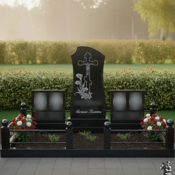 Представленная мемориальная композиция — это величественный ансамбль, созданный для оформления родового захоронения на четыре персоны. В центре художественного решения находится высокая вертикальная стела с изящным асимметричным изгибом навершия, напоминающим застывшую в камне волну. На фасадной части центрального элемента выполнена искусная резьба: лаконичный православный крест с детализированным распятием возвышается над пышным букетом калл. Тонкая проработка лепестков придает цветам визуальный объем и нежность, которая особенно эффектно смотрится на фоне зеркальной полировки камня. Игра контрастов между черной блестящей поверхностью и светлыми матовыми линиями гравировки создает ощущение глубины и одухотворенности.