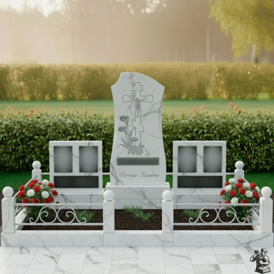 По бокам от главной стелы расположены два симметричных блока, предназначенных для размещения портретов и имен близких людей. Строгая геометрия этих плит уравновешивает плавные линии центральной части, придавая всей конструкции устойчивость и гармонию. Каждая деталь — от каллиграфической надписи «Вечная Память» у основания до мягких фасок на гранях — свидетельствует о высоком качестве исполнения и глубоком уважении к памяти ушедших.