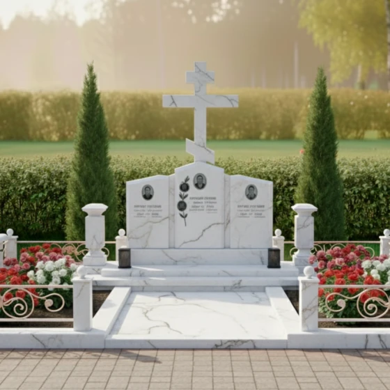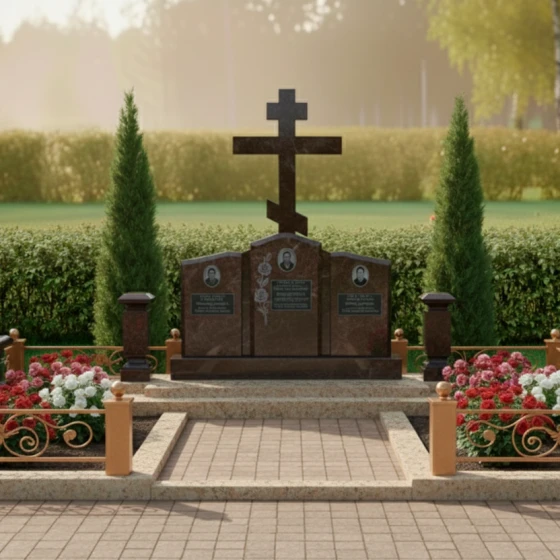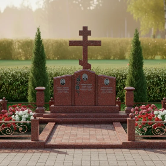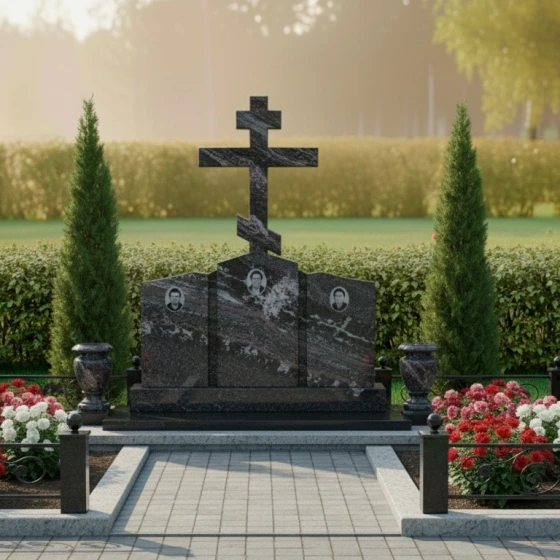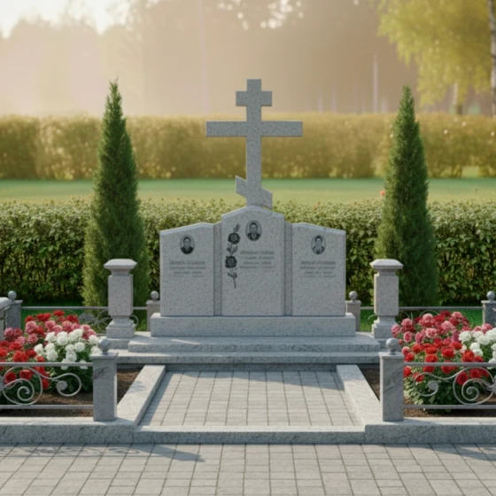 Кому подойдет: Данная мемориальная композиция является идеальным решением для семейного захоронения на три персоны. Благодаря своей трехчастной структуре и доминирующему православному кресту, она станет достойным символом вечной связи между супругами или родителями и детьми. Модель рекомендована тем, кто ценит каноническую строгость, надежность материалов и хочет обустроить участок в едином, законченном стиле, который не потребует реконструкции в течение многих поколений.