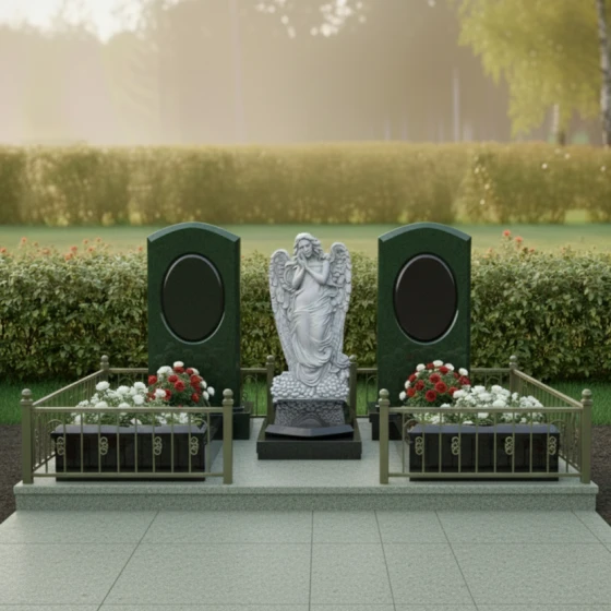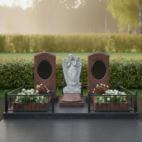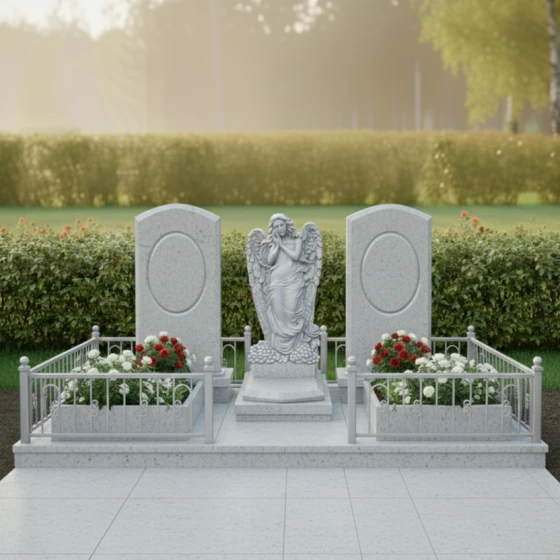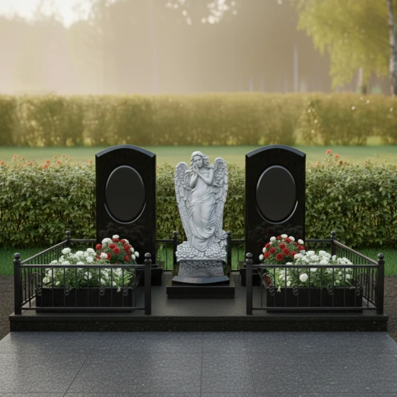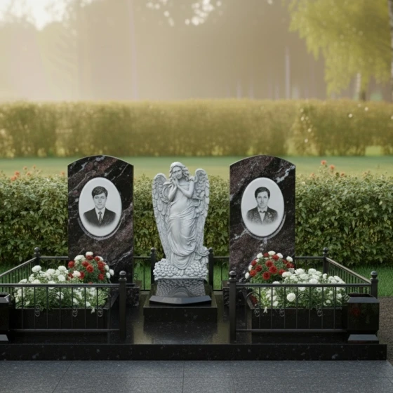 Этот величественный гранитный монумент представляет собой художественную композицию, в центре которой находится скульптура скорбящего ангела. Образ небесного защитника, выполненный с ювелирной точностью, олицетворяет покой, нежность и вечную память о дорогих людях. Его раскинутые крылья словно укрывают две симметричные вертикальные плиты, создавая атмосферу уединения и святости места захоронения. Скульптурная резьба ангела поражает своей детализацией: плавные линии драпировки одежд, объемное, многослойное оперение крыльев и смиренно сложенные руки передают глубокую скорбь и одновременно светлую надежду. Особый фокус на игре света и тени на матовой текстуре фигуры в сочетании с зеркальным блеском полированного камня создает удивительный эффект объема и торжественности.