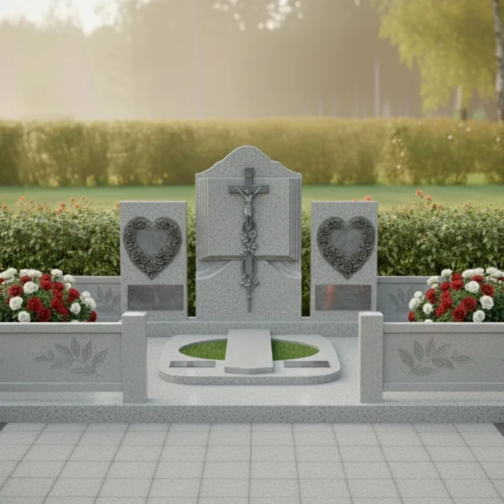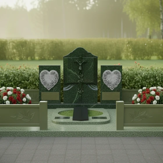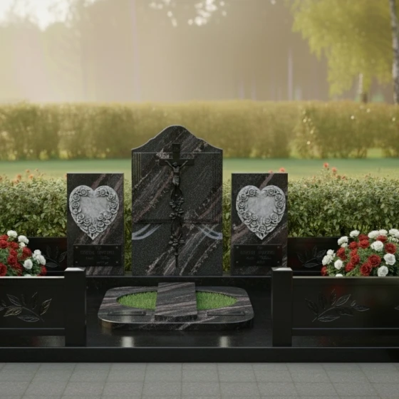 Каждая деталь этого комплекса наполнена глубоким смыслом. Форма книги — это символ мудрости и памяти, которая никогда не будет стерта. Сердца, обрамленные цветами, олицетворяют бесконечную любовь и нежность, оставшуюся в сердцах живых. Строгие вертикальные линии в сочетании с плавными изгибами резьбы создают баланс между мужской твердостью и женской мягкостью, что делает этот гранитный монумент идеальным выбором для парного или семейного захоронения. Массивность конструкции внушает чувство защищенности и вечного покоя, превращая участок в настоящий мемориальный храм под открытым небом.