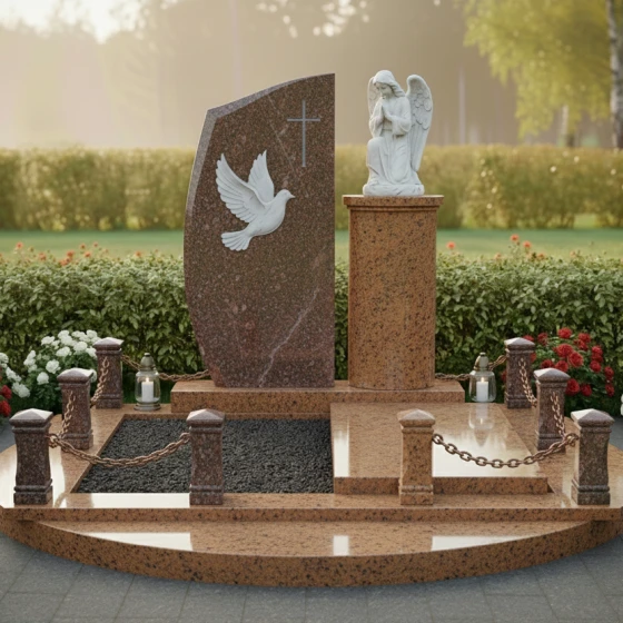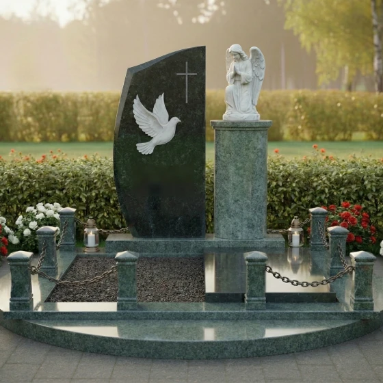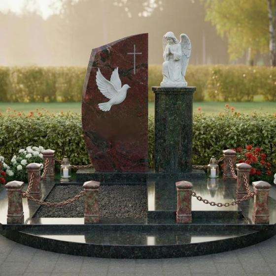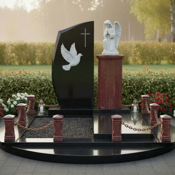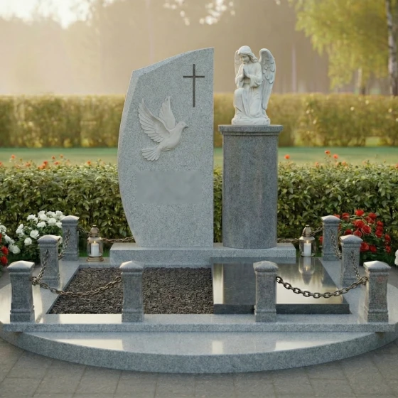 Особую художественную ценность представляет объемная статуя ангела, склонившегося в молитве на изящном цилиндрическом постаменте. Его детально проработанные крылья и смиренная поза создают атмосферу небесного покровительства и неустанного заступничества. Тонкий лаконичный крест, вырезанный на основной плите, уравновешивает композицию, напоминая о стойкости веры. Благоустройство участка продумано до мелочей: массивный цоколь с декоративными столбиками и тяжелыми цепями очерчивает границы мемориала, создавая защищенное, уединенное пространство. Комбинированная надгробная плита, сочетающая зеркальную полировку и зону с декоративным гравием, придает участку современный европейский вид и эстетическую легкость.