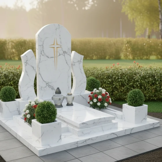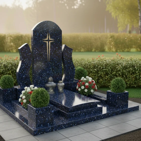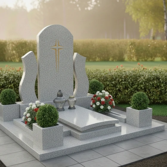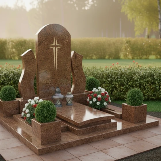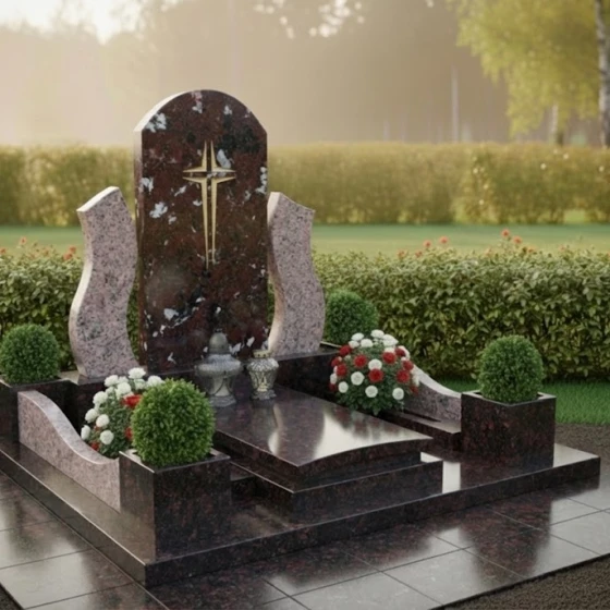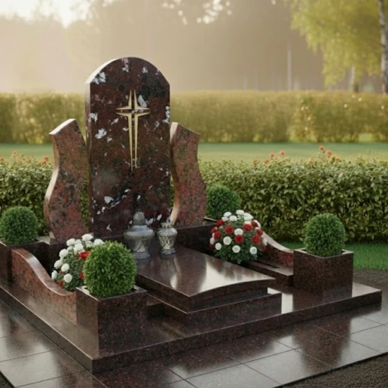 - Комплектация: Основная стела, боковые декоративные элементы, многоуровневая надгробная плита, массивный цоколь.