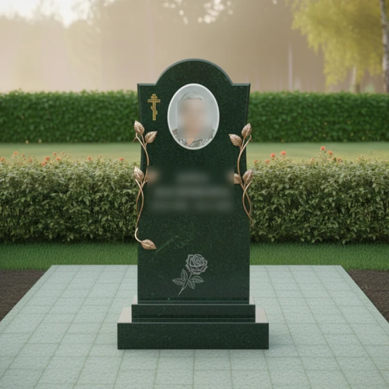 Особое внимание привлекает объемный декор: стелу обрамляют изящные ветви роз, выполненные в цвете античной бронзы. Лепестки цветов проработаны с ювелирной точностью, создавая эффект живого растения, застывшего в камне. Эти изгибающиеся стебли с объемными листьями словно обнимают портрет, символизируя неувядающую любовь и непрерывность жизненного пути, оставшегося в памяти близких.