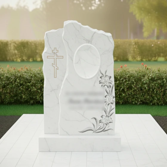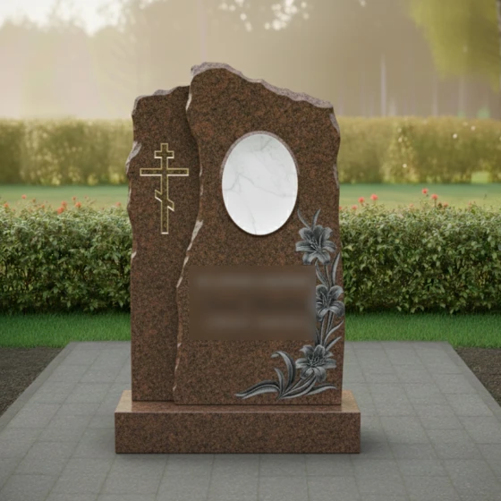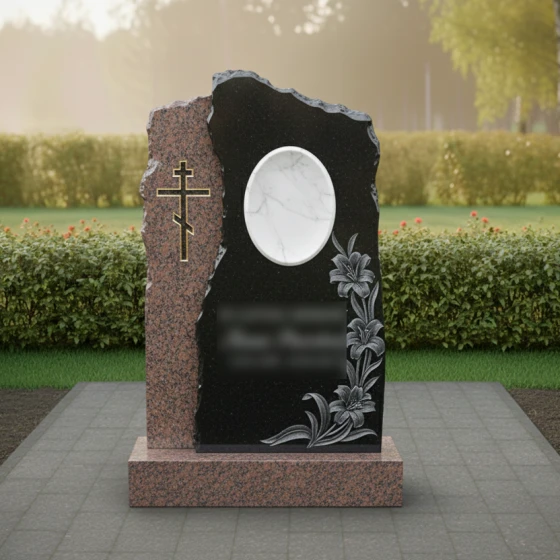 - Художественные элементы: Рельефная резьба в виде лилий, гравированный православный крест, подготовленная ниша под керамический или мраморный портретный медальон.
