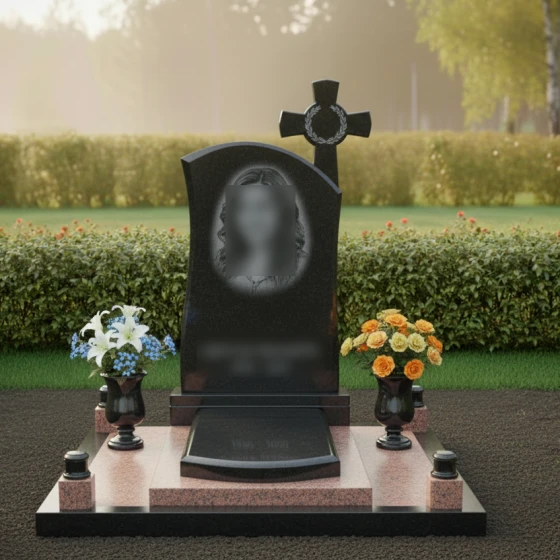 Оформление: Благодаря большой площади зеркальной поверхности стелы, здесь идеально будет смотреться классическая гравировка портрета в полный рост или крупный погрудный план. Резная рама, образованная изгибом камня и крестом, естественным образом фокусирует взгляд на лице. Для светлых видов камня (Мансуровский, Тассо) мы рекомендуем установку фотокерамики в нише или использование глубокой пескоструйной резки букв с последующим покрытием сусальным золотом или «античным» акрилом, что придаст надписям объем и читаемость при любом освещении.