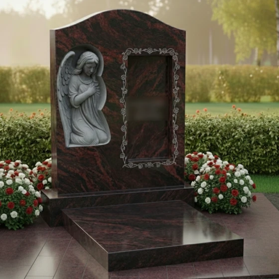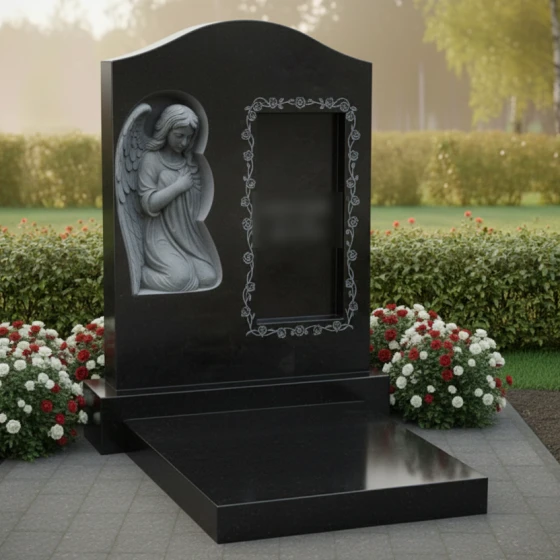 В левой части стелы расположен изящный барельеф, изображающий ангела с опущенной головой и сложенными в молитве руками. Крылья ангела аккуратно сложены, а его поза выражает смирение, скорбь и вечную молитву. Каждый завиток волос, каждая складка одеяния и каждое перышко на крыльях проработаны с исключительной тонкостью, передавая ощущение легкости и воздушности, несмотря на монолитность камня. Этот барельеф, выполненный в светлом, матовом оттенке, выделяется на фоне идеально отполированной черной поверхности, создавая эффект свечения и придавая композиции особую сакральность.