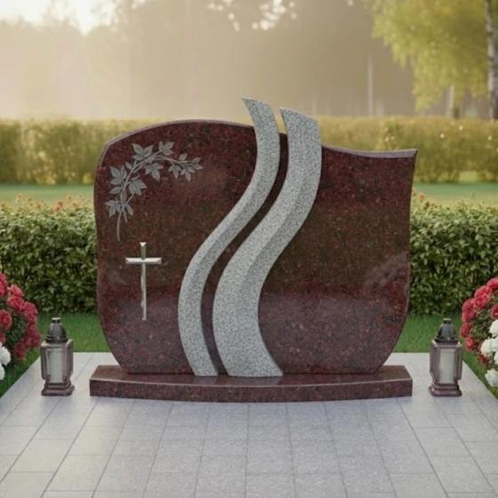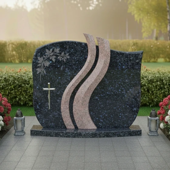 Величественная стела ПН 701 представляет собой уникальное сочетание классической элегантности и современной динамики. Основа стелы – это массивная плита из глубокого черного гранита, чья идеально отполированная поверхность отражает мир вокруг, словно зеркало, символизируя чистоту души и бесконечность памяти. Верхняя часть стелы имеет плавный, волнообразный изгиб, который придает ей ощущение легкости и устремленности вверх, словно душа, возносящаяся к небесам. Этот изгиб не просто декоративный элемент; он создан с филигранной точностью, демонстрируя виртуозность работы с камнем. Боковые грани стелы также тщательно обработаны, повторяя общий волнообразный контур, что создает гармоничный и завершенный образ. На левой стороне стелы, на фоне глубокого черного гранита, искусно выгравирована ветвь с нежными листьями, выполненная в технике матовой гравировки. Ее светлый, почти серебристый оттенок контрастирует с зеркальной поверхностью камня, придавая изображению объем и реалистичность. Ниже ветви расположен лаконичный православный крест, также выполненный методом гравировки, его строгие линии подчеркивают духовную составляющую монумента. Центральным элементом композиции являются две вертикальные, изогнутые ленты, выполненные из светлого, мелкозернистого гранита. Эти ленты, словно два потока, переплетаются и устремляются вверх, символизируя неразрывную связь между мирами и вечное движение жизни и памяти. Их матовая, слегка шероховатая фактура создает интересный тактильный и визуальный контраст с полированной черной стелой, подчеркивая глубину и многогранность композиции.